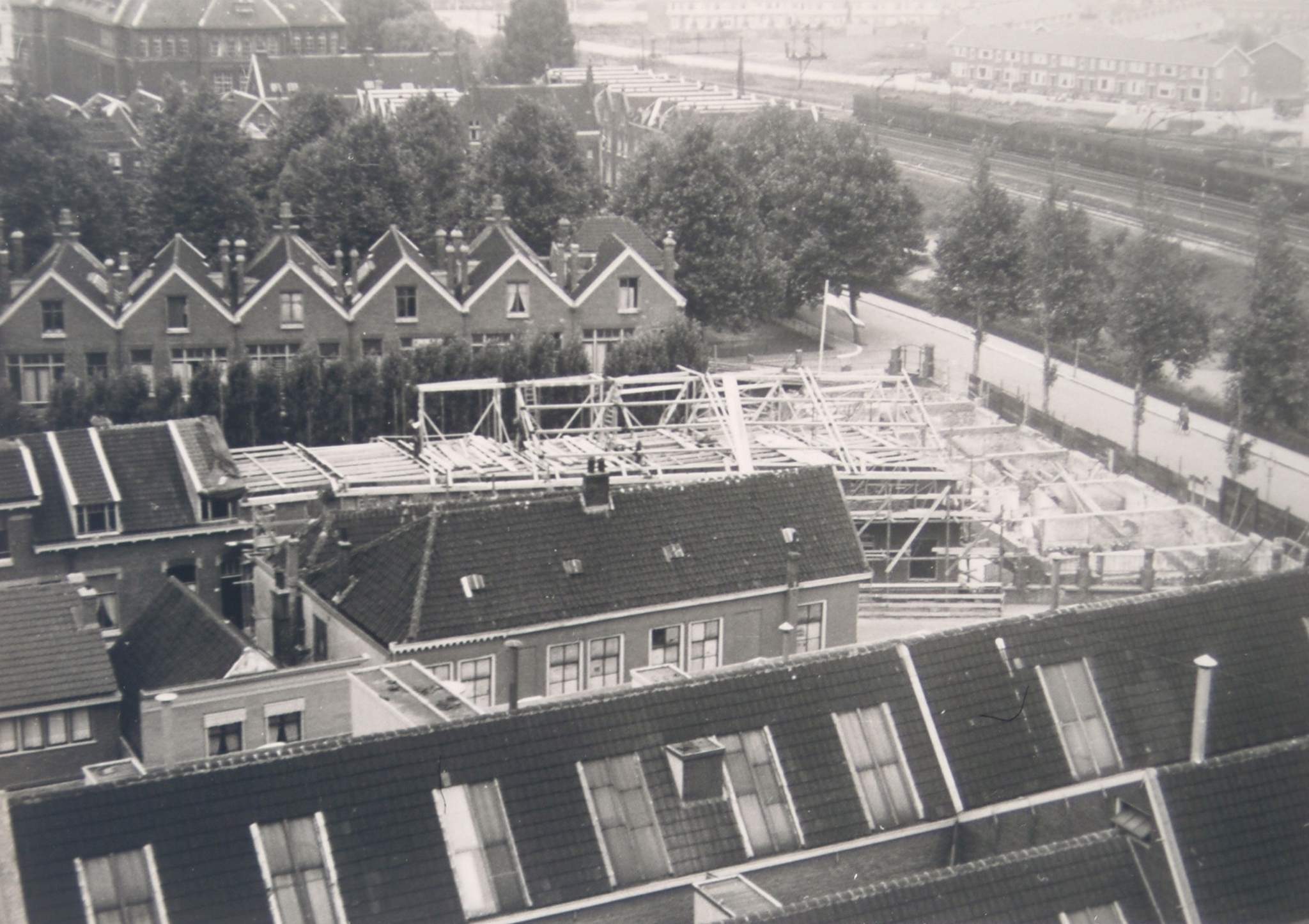 - Bouwactiviteiten in de Hoge Bakstraat. Linksboven het Refajaziekenhuis aan de zijde van de Bellevuestraat. Rechts, boven de spoorbaan ligt de Vlietweg, onder de spoorbaan de Havenstraat..