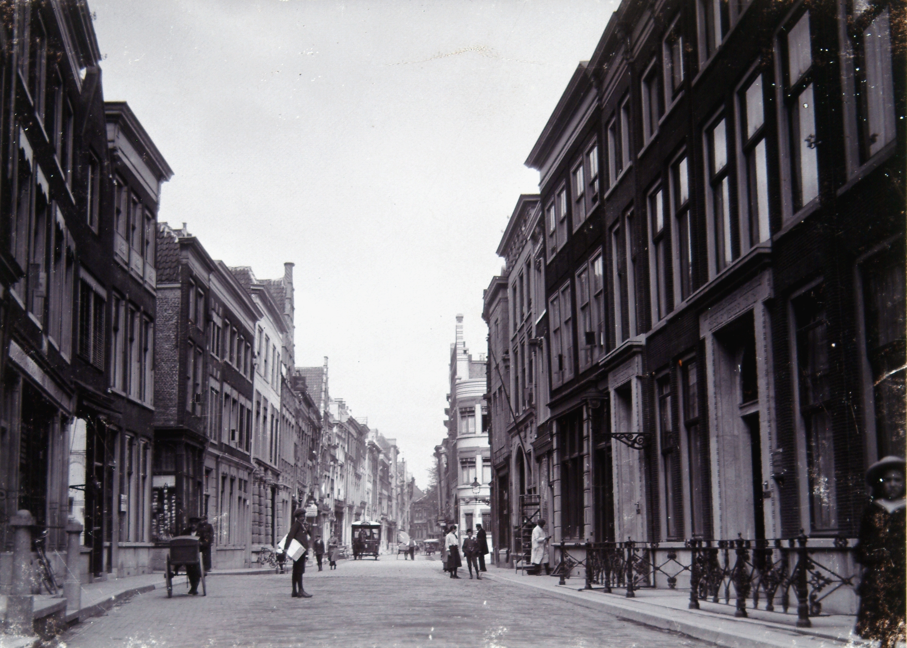 - De Groenmarkt in de richting van de Visbrug. Bij de bakkerskar loopt naar links de Vleeshouwerstraat.