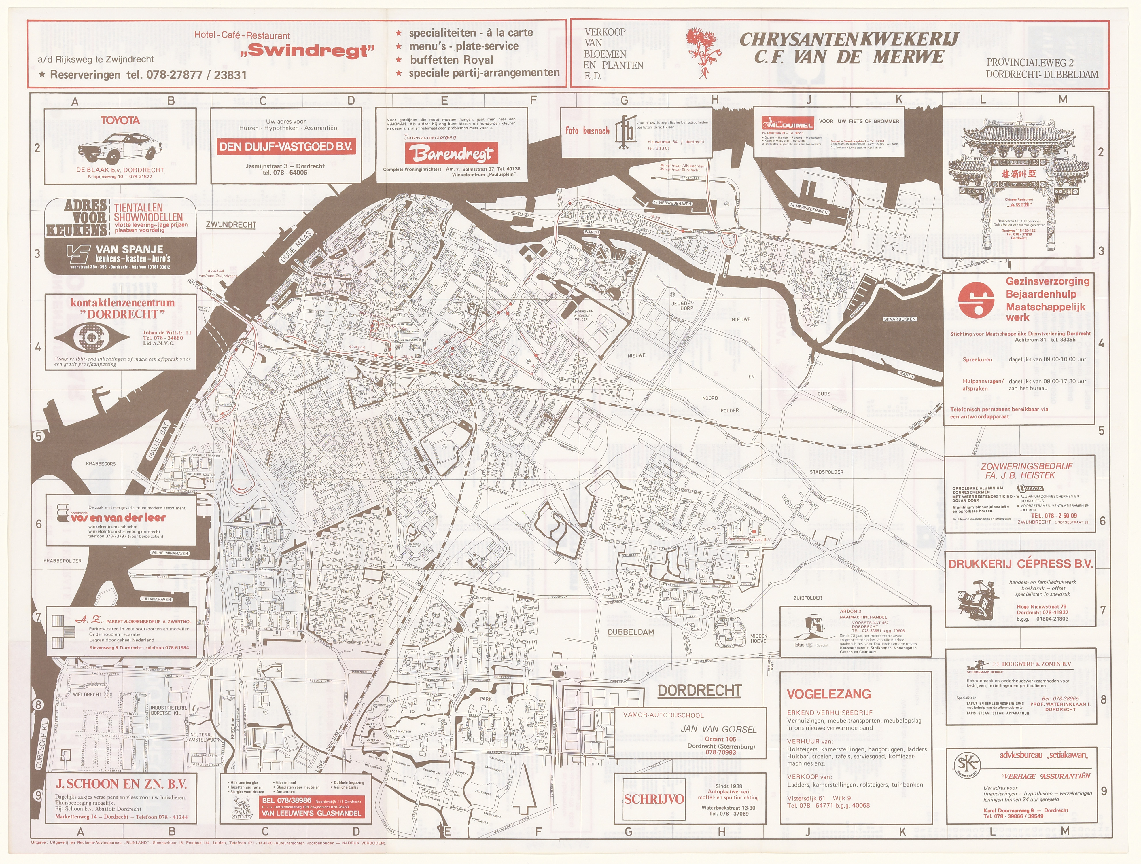 - Plattegrond van Dordrecht met straatindex en reclame.