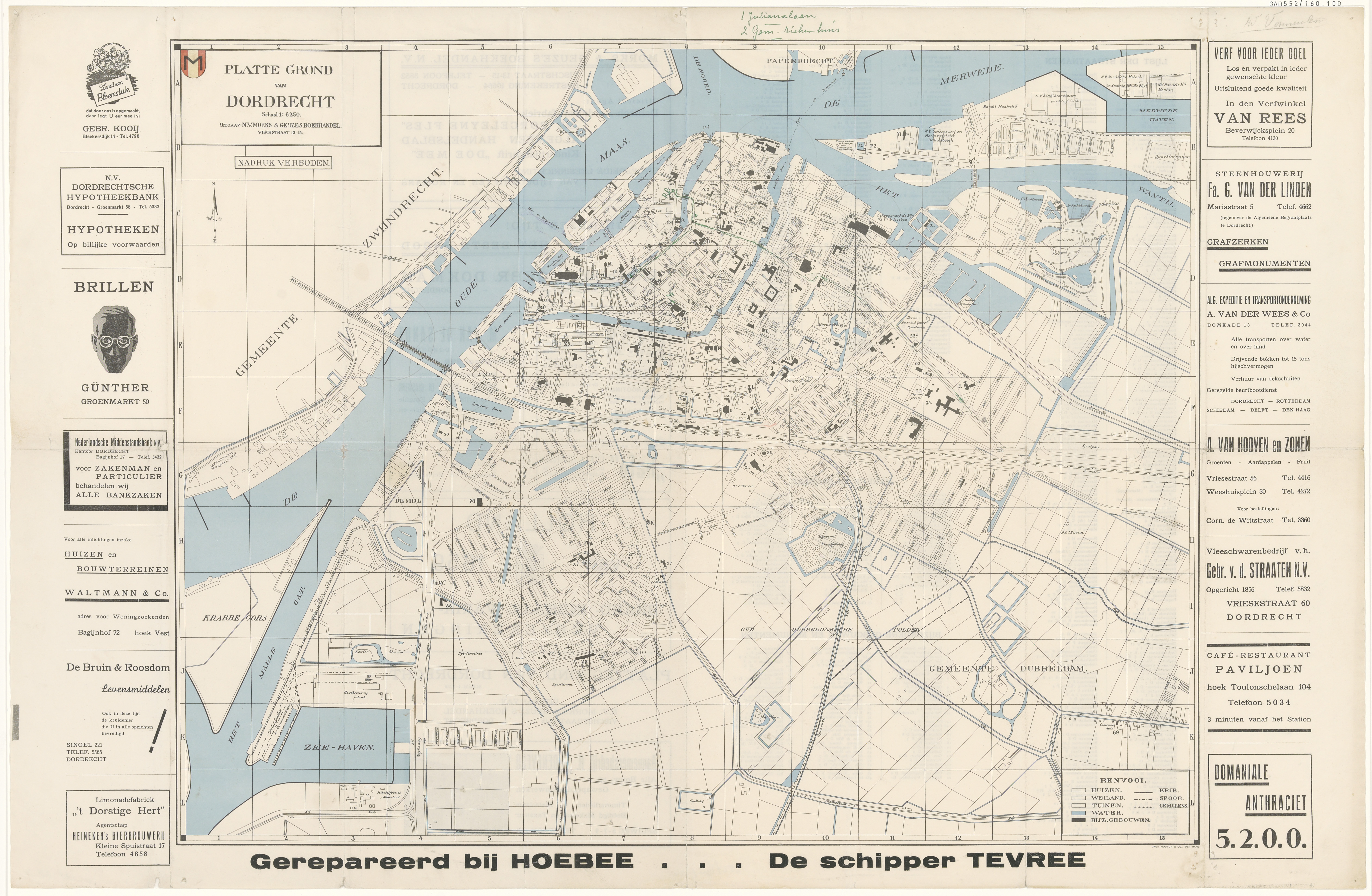 - Plattegrond van Dordrecht met randreclame en stratenindex.