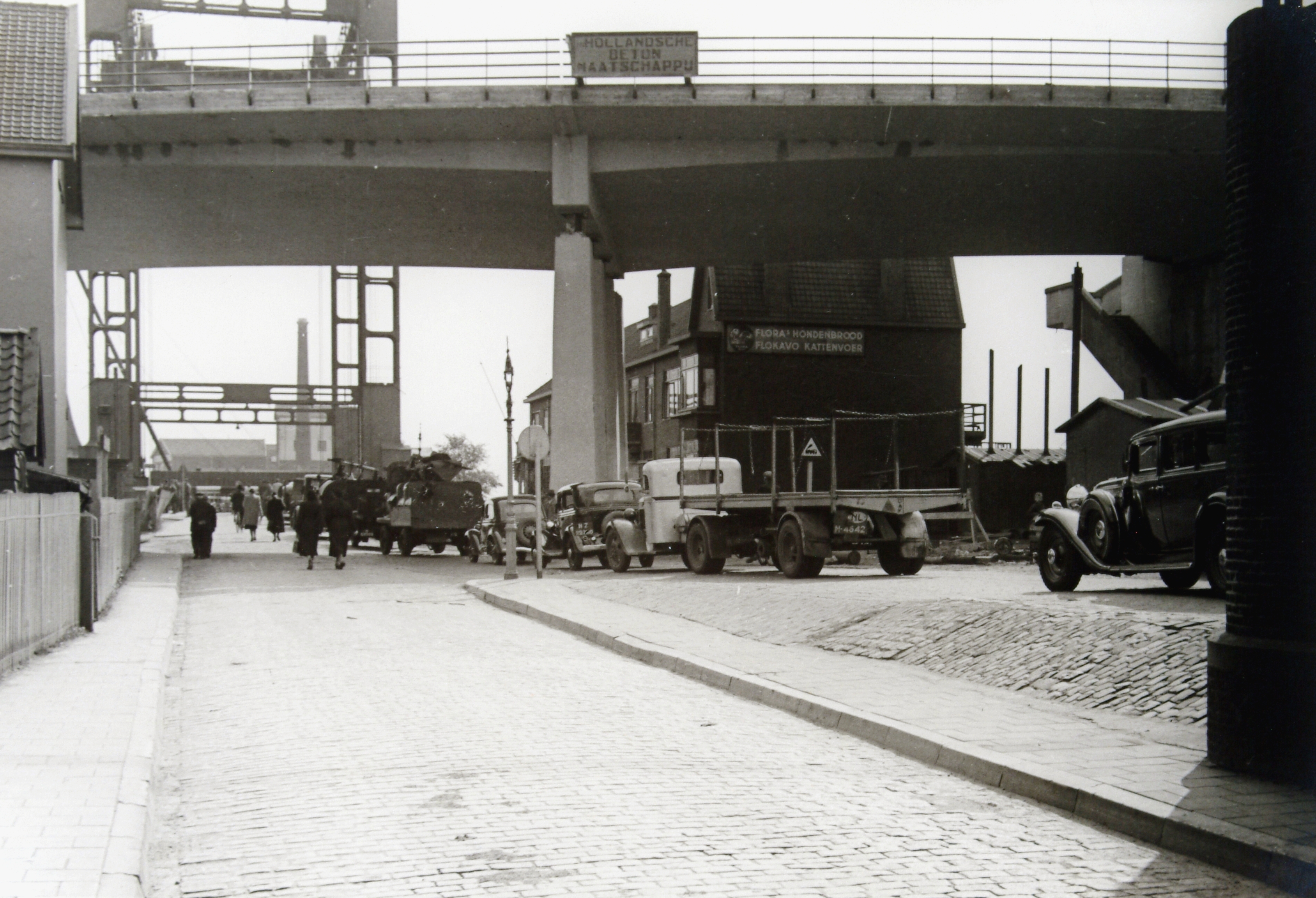 De Dokweg met het pas gebouwde viaduct van de verkeersbrug naar Zwijndrecht. Op de …