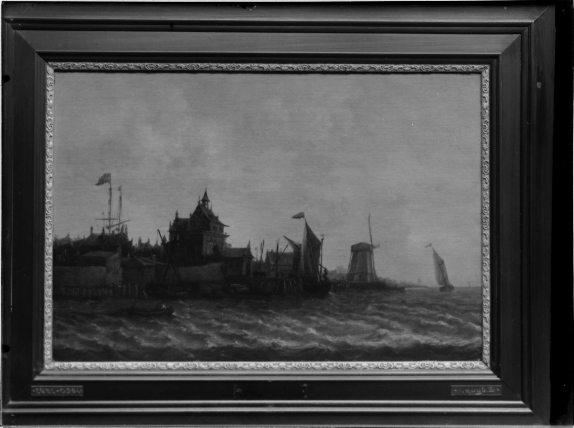 Schilderij van de Riedijkspoort en rivier vol schepen