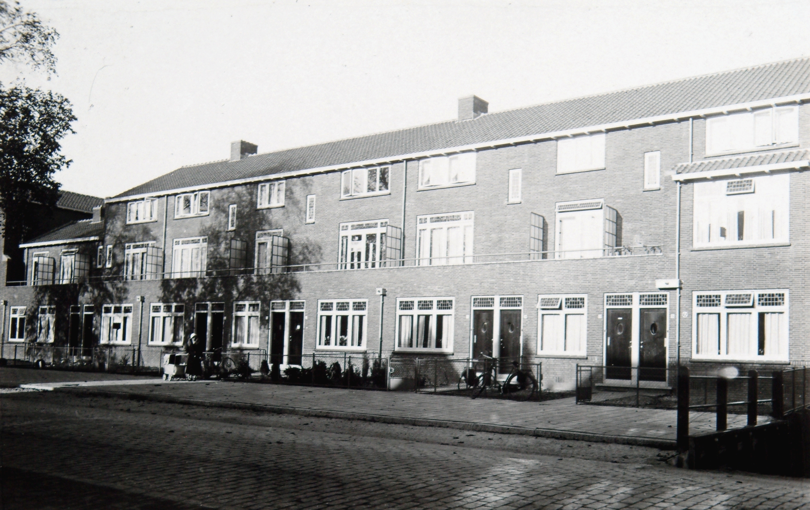 - Enkele panden aan de noordzijde van Reeweg Oost, ten zuidoosten van de Riouwstraat. Het hek rechts markeert de scheiding tussen trottoir en een sloot.