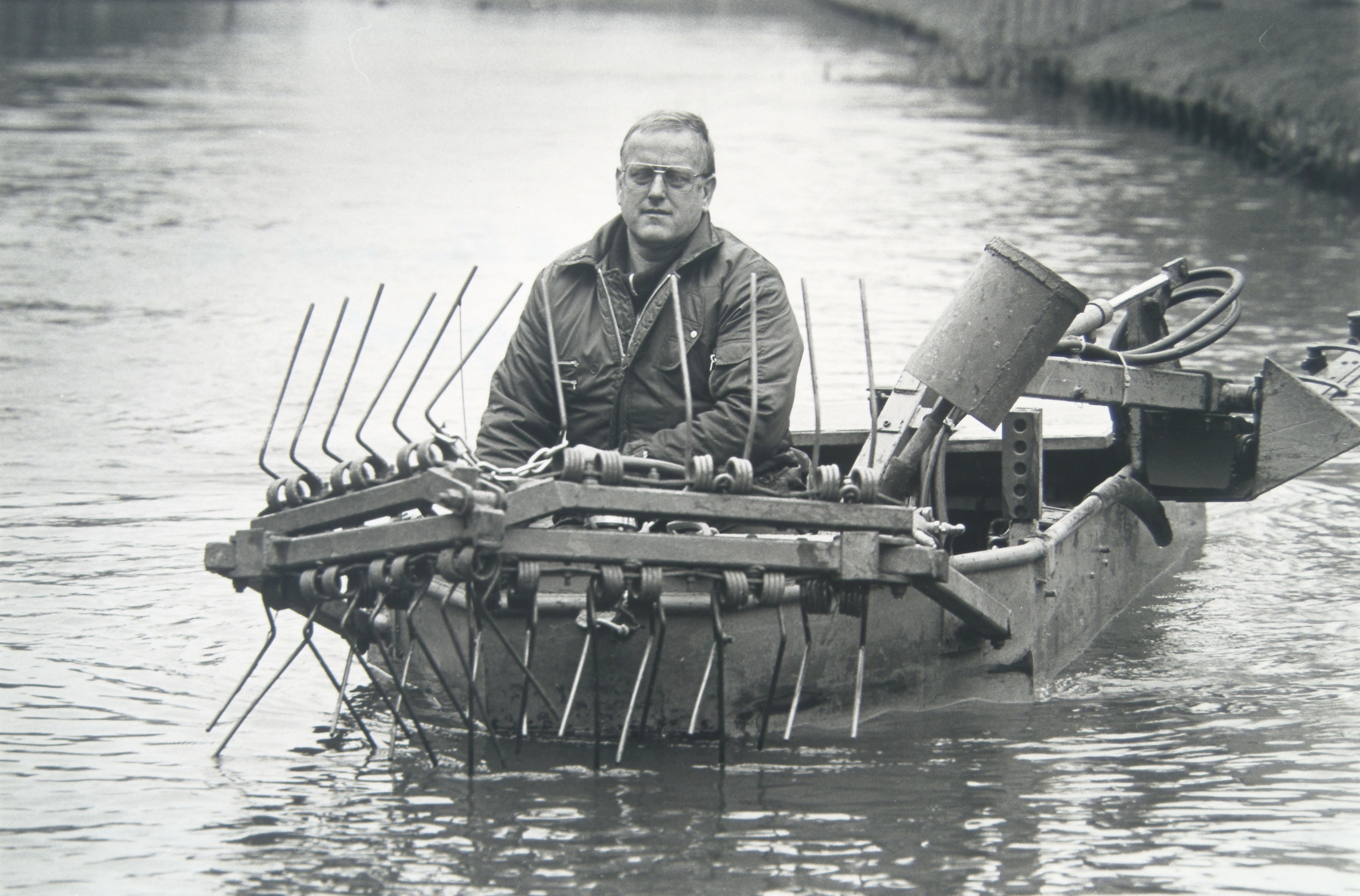 - Sjaak van de Ven aan het stuur van een veegboot, een waterafvalverwijderend vaartuig