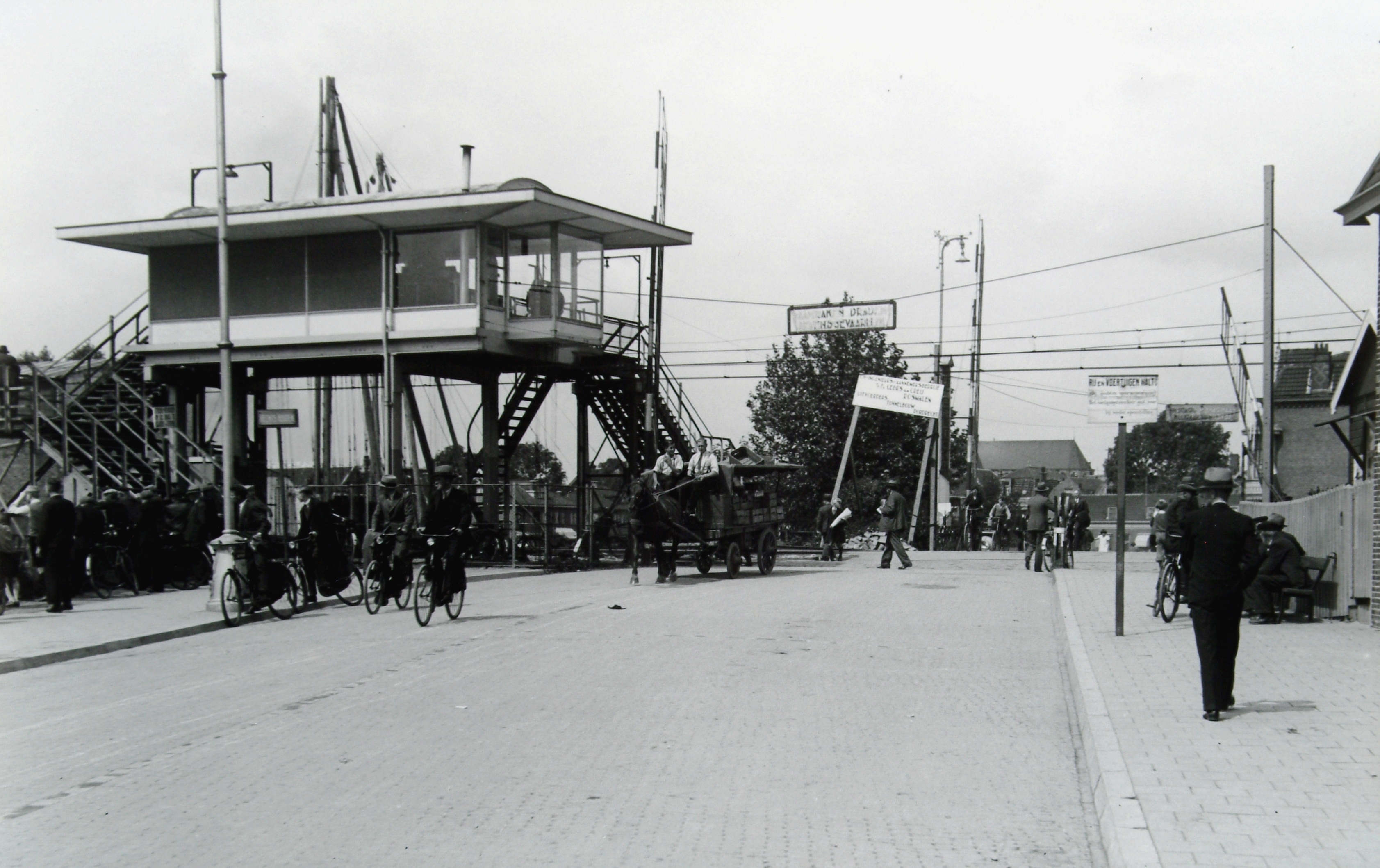 - De overweg aan de Spuiweg met een voetgangersbrug over het spoor, gezien vanaf Krispijn in de richting van de stad.