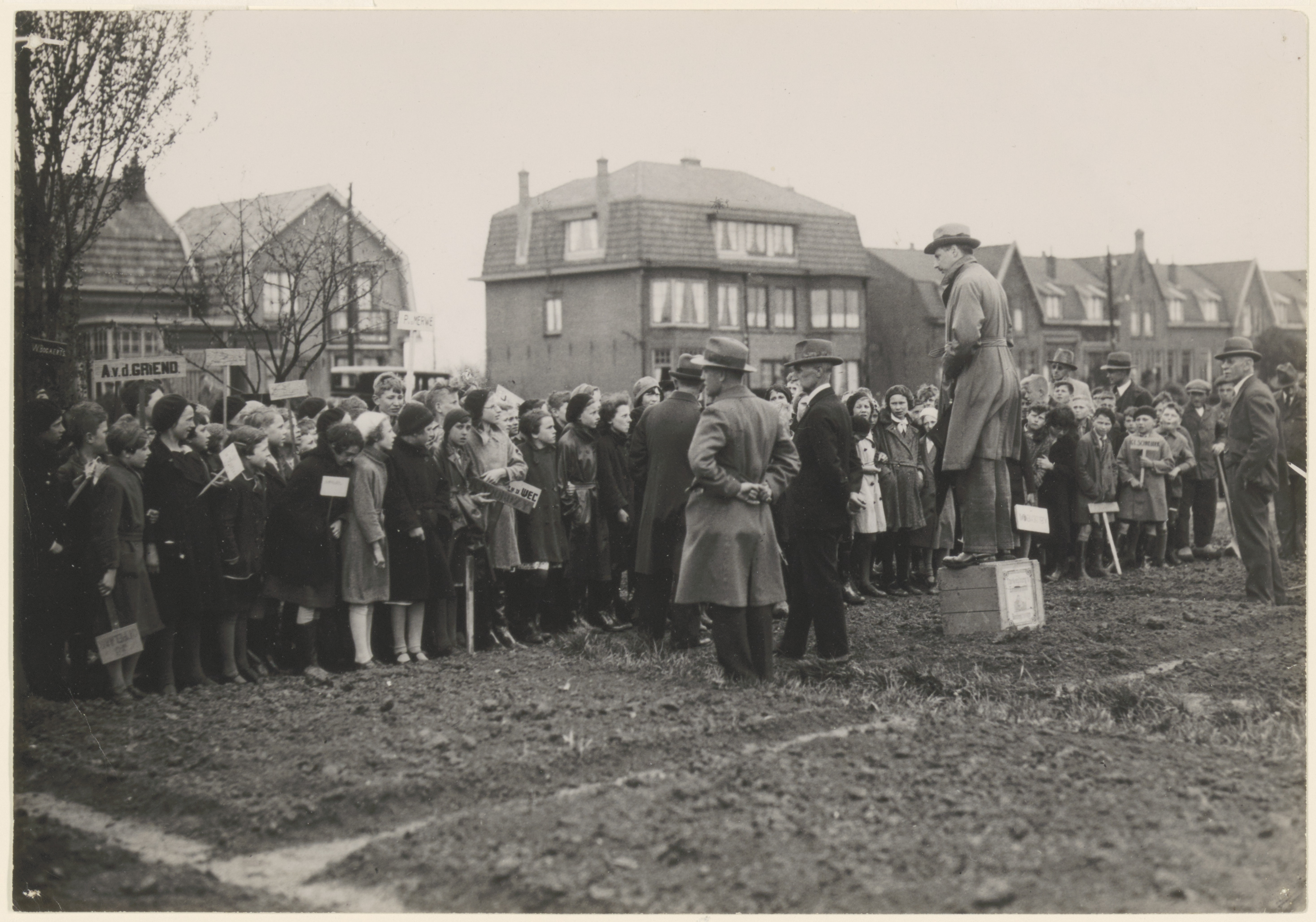 - Jaarlijkse opening van de schooltuintjes aan de Reeweg Oost. Geheel rechts de onderwijzer P. v.d. Broek.