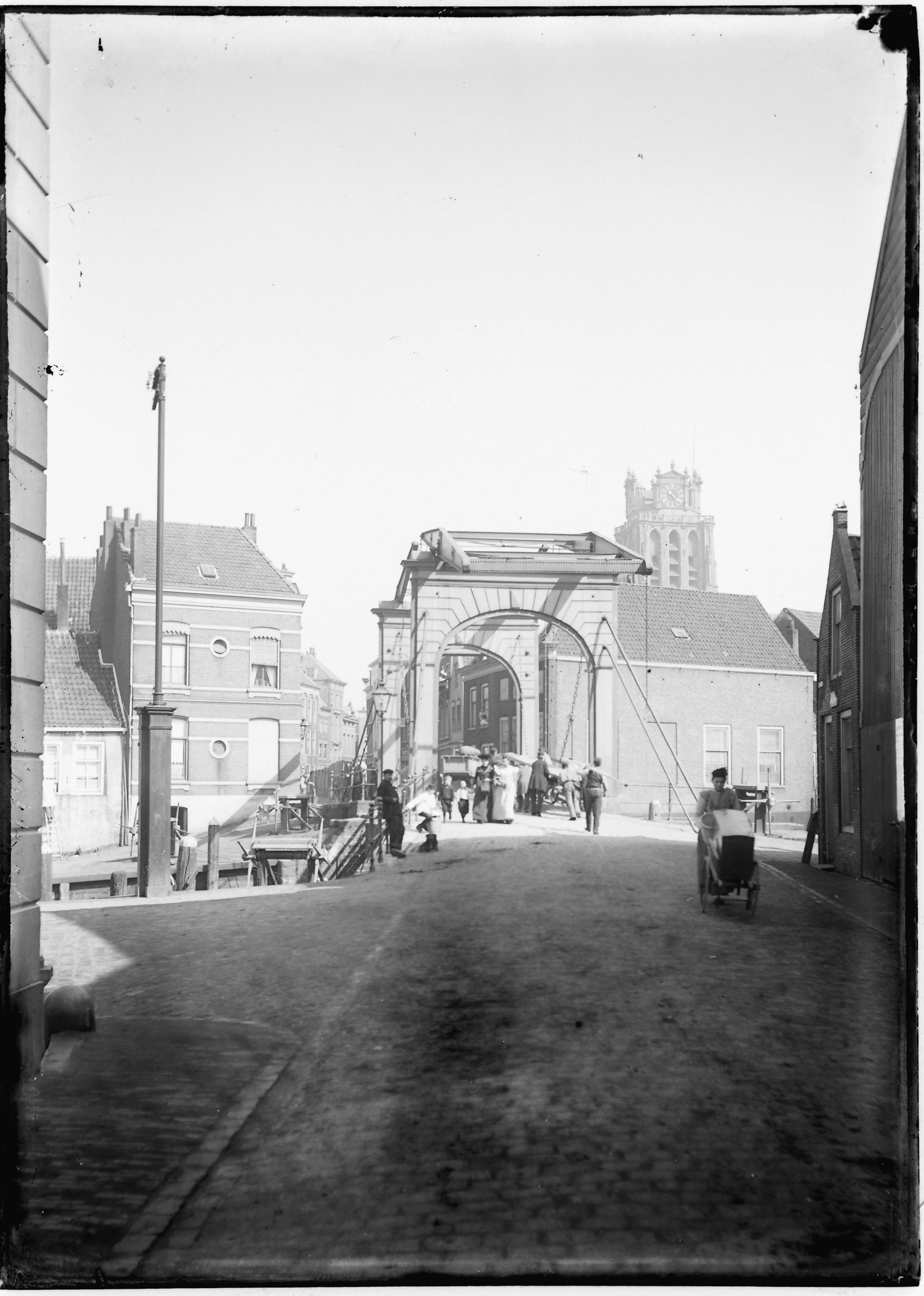 De opname is 1906 of eerder. De dubbele ophaalbrug is in de periode 27 augustus 1906 - 5 juni 1907 vervangen. De oude brug werd op eerstgenoemde datum gesloten voor het verkeer en op laatstgenoemde datum werd de nieuwe enkelvoudige stalen ophaalbrug opengesteld. https://proxy.archieven.nl/46/14AC1EFA659841C78E725944A8AF5792 https://resolver.kb.nl/resolve?urn=MMKB08:000170140:mpeg21:p006