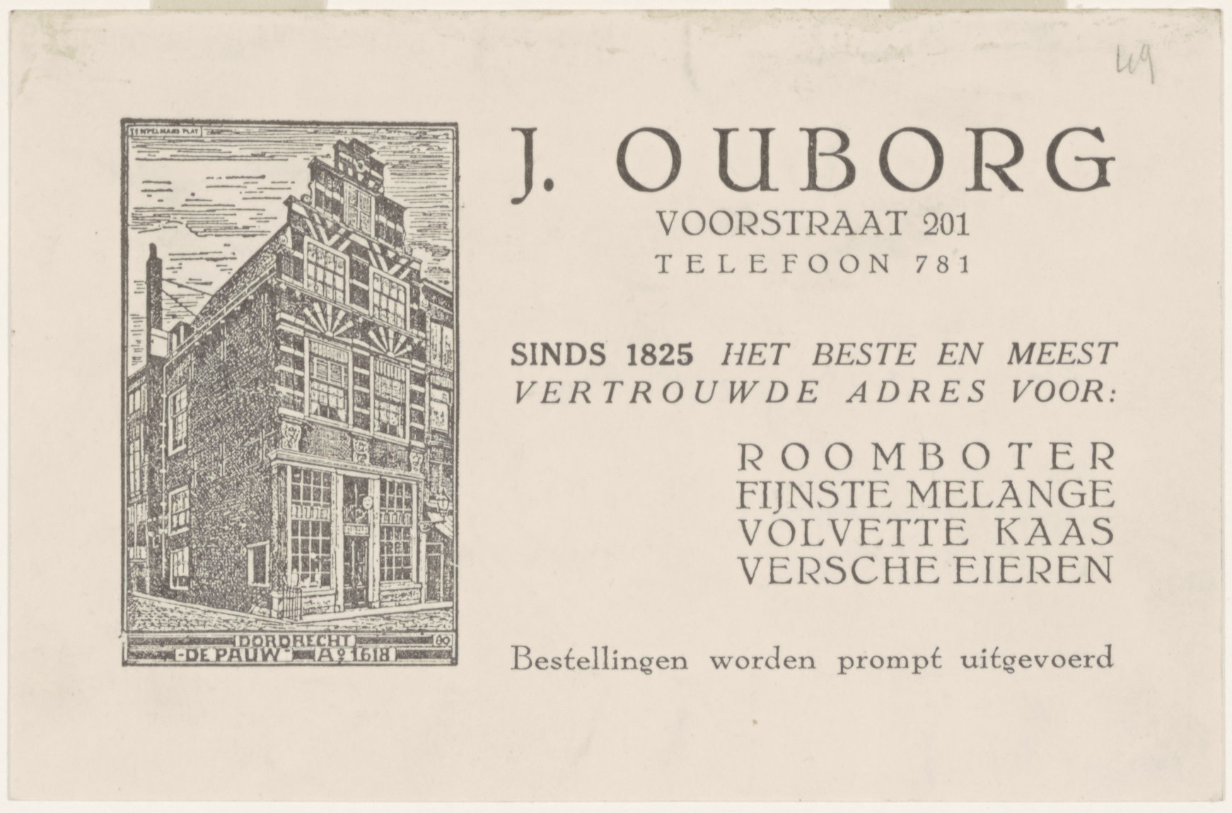 - Reclamekaart van kaashandel J. Ouborg op de Voorstraat. De winkel was gevestigd rechts van het afgebeelde huis De Pauw.