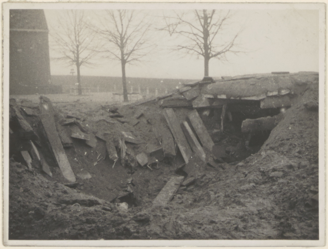 - De vernielde schuilkelder aan de Krispijnseweg vóór de Marnixschool.