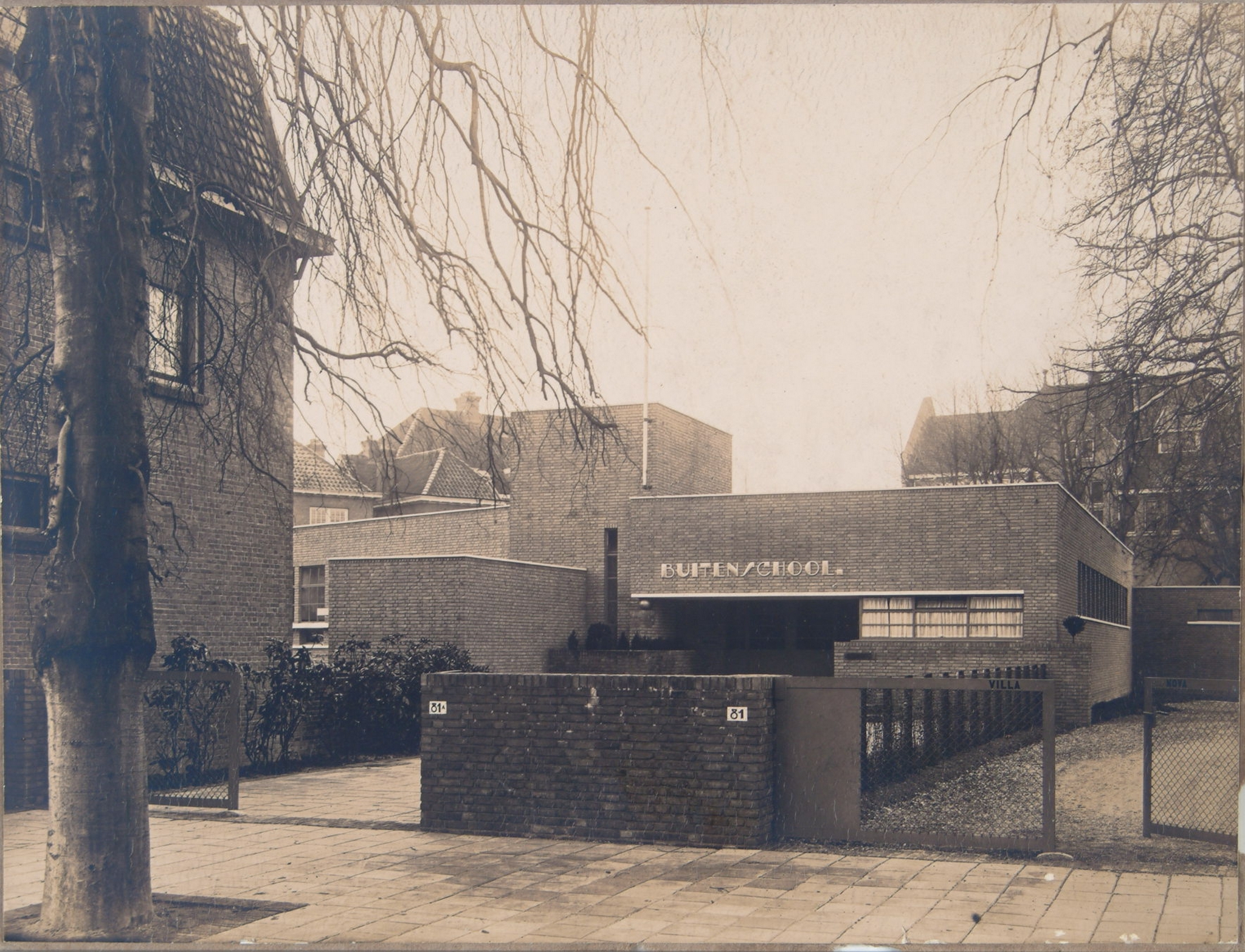 - Ingang van de Buitenschool aan de Vrieseweg 81A voor onderwijs aan kinderen met tuberculose. Rechts op de achtergrond de HBS in het Oranjepark.