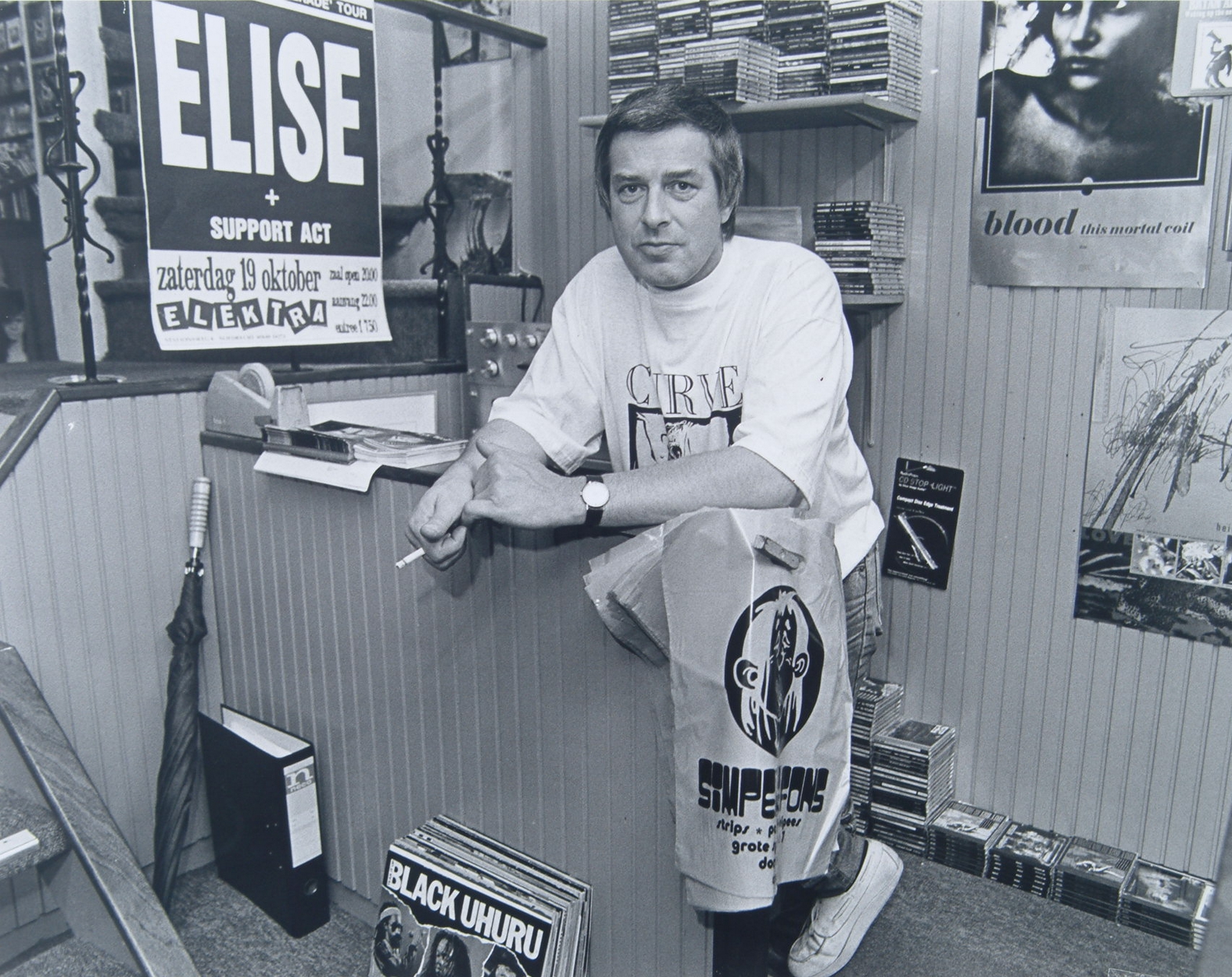 Dirk v. d. Lee in zijn popmuziekwinkeltje Simpele Fons in de Grote Spuistraat