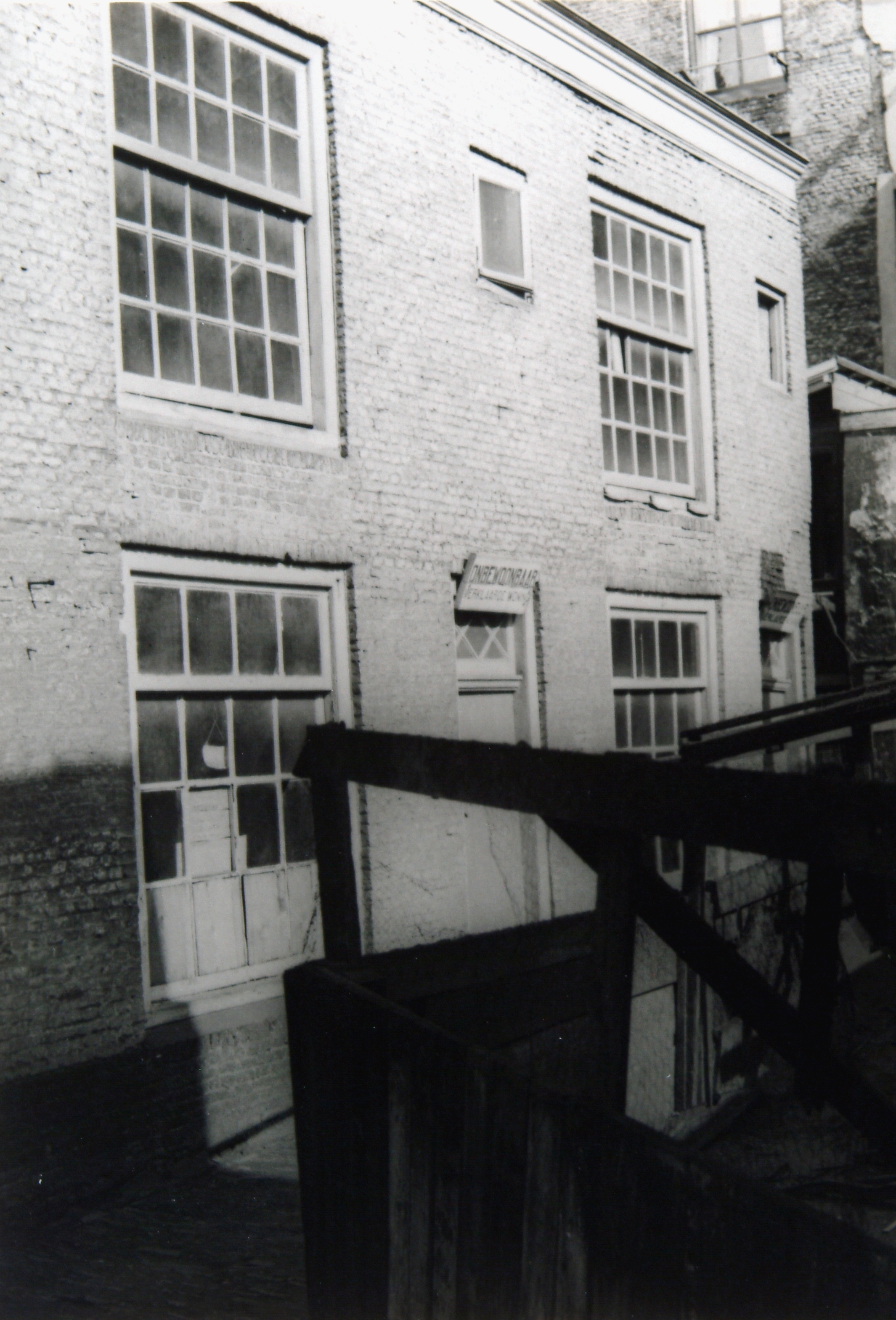 Gezicht op een hofje bij de Schotsentuin met een onbewoonbaar verklaarde woning.