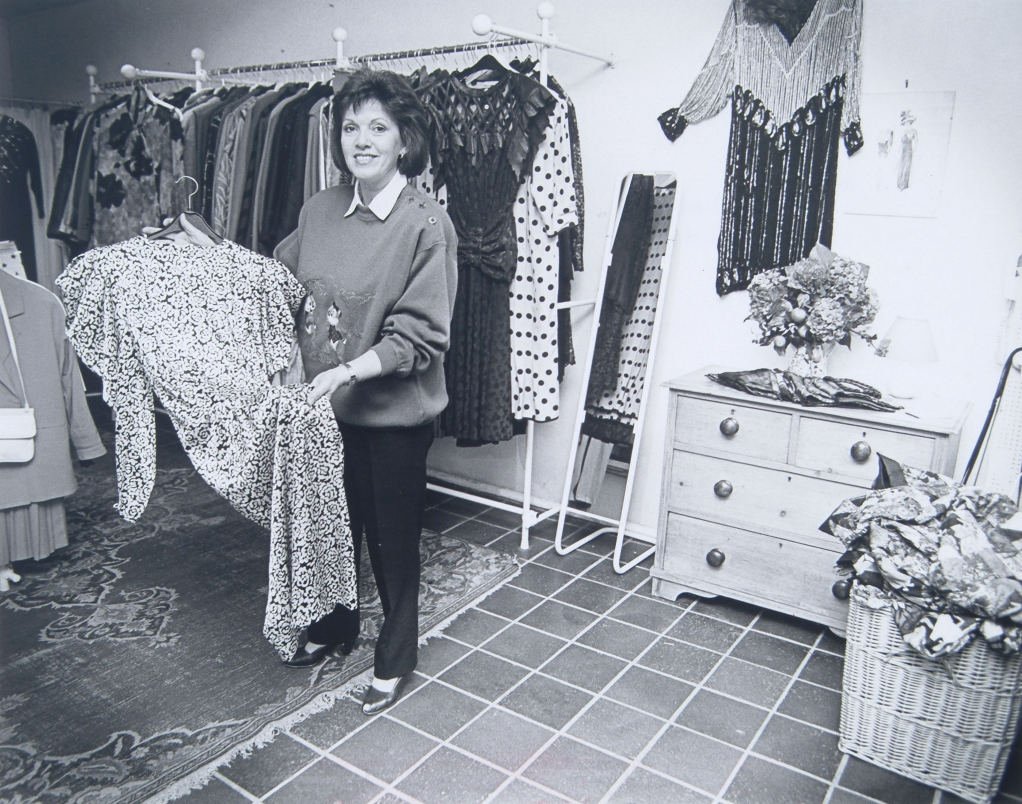 - Hanneke Boer toont een jurk in haar winkeltje in tweedehands kleding aan de Voorstraat