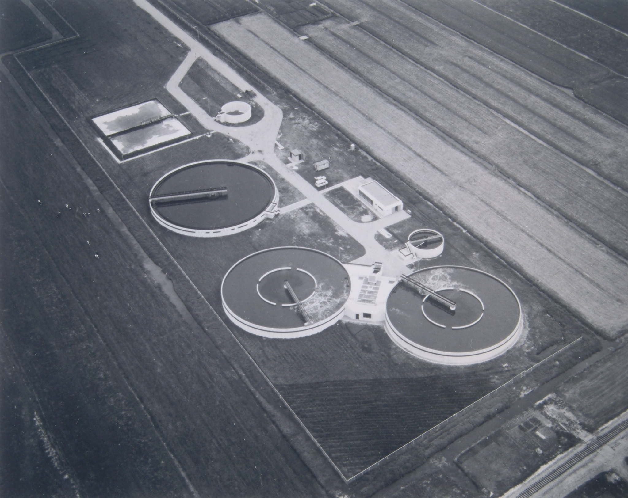 Luchtopname van de afvalwaterzuiveringsinstallatie aan de Kweldamweg te Sliedrecht. …