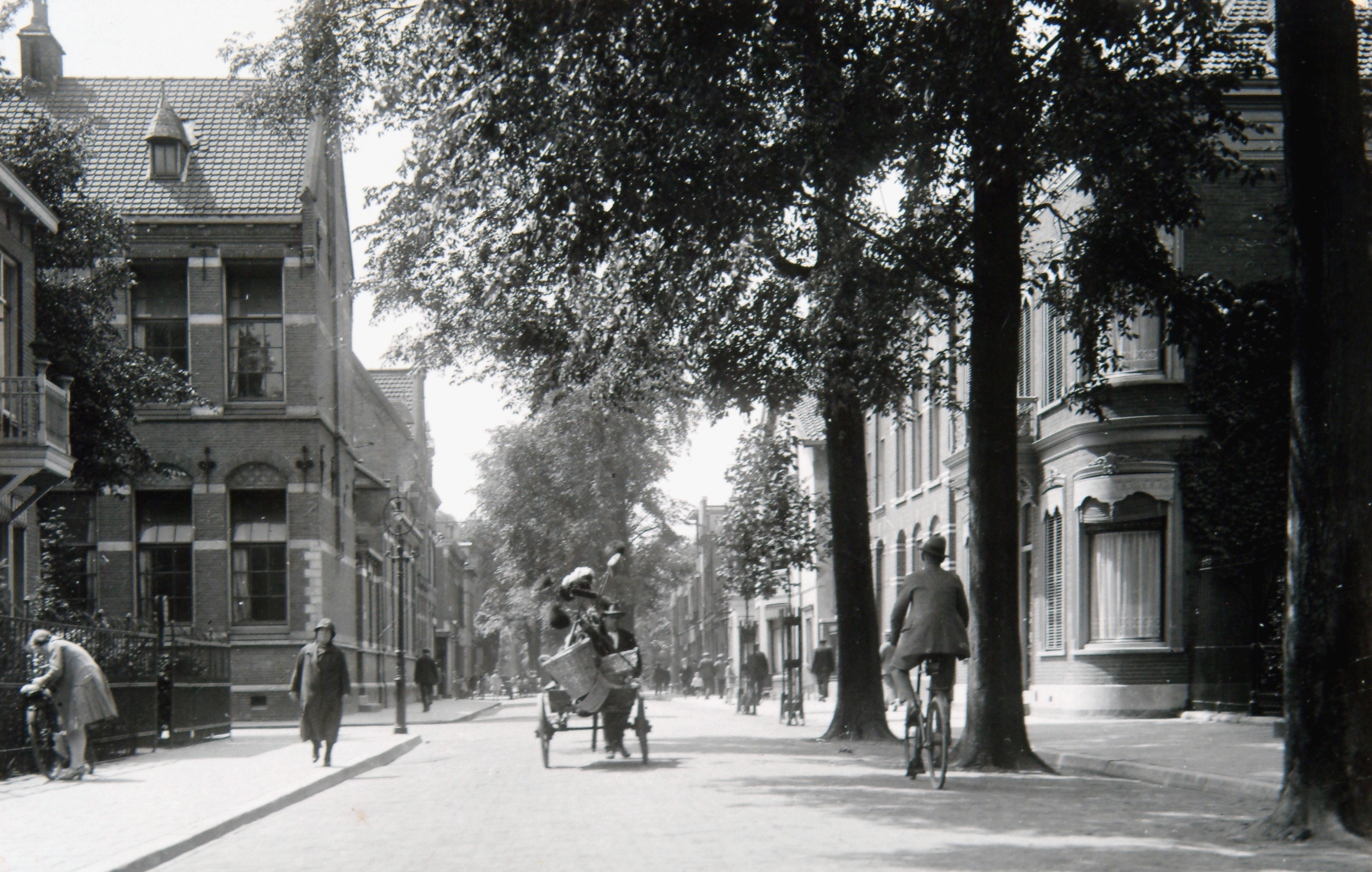 - Gezicht op de Godfried Schalckensingel vanaf de Noordendijk in de richting van de St. Jorisweg. De eerste straat links is de Steltenstraat, met op de hoek een gemeenteschool. De man met de handkar vervoert manden en bezems.