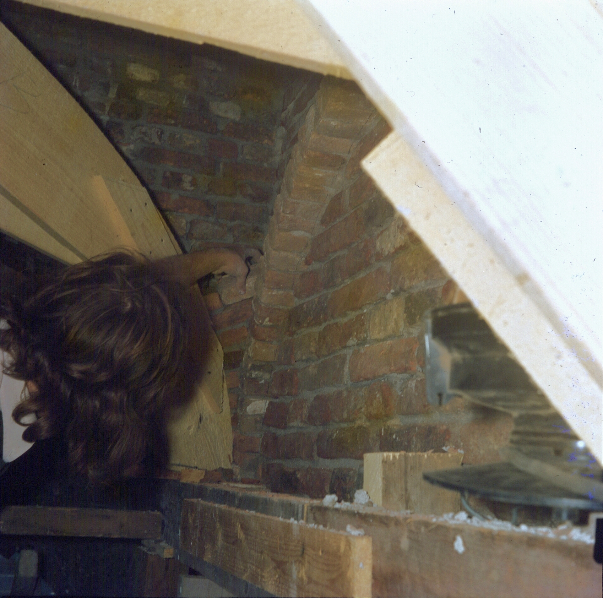 Het plaatsen van het geraamte voor het Gotische gewelf van de Groothoofdspoort, voor de doorgang naar de Palingstraat.