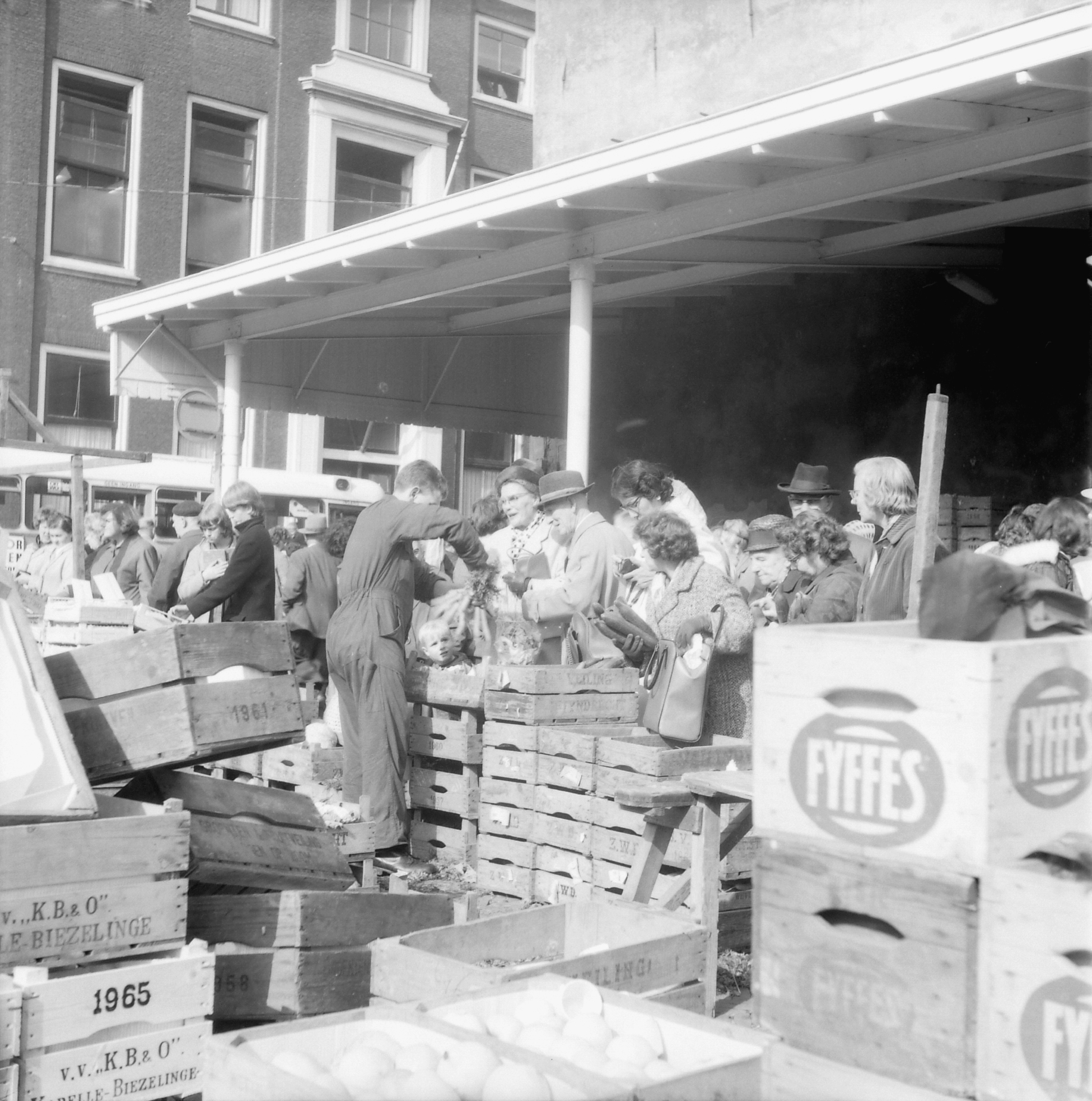 Botermarkt. Marktdag. Groentekraam. De stadsbus rijdt door de Wijnstraat