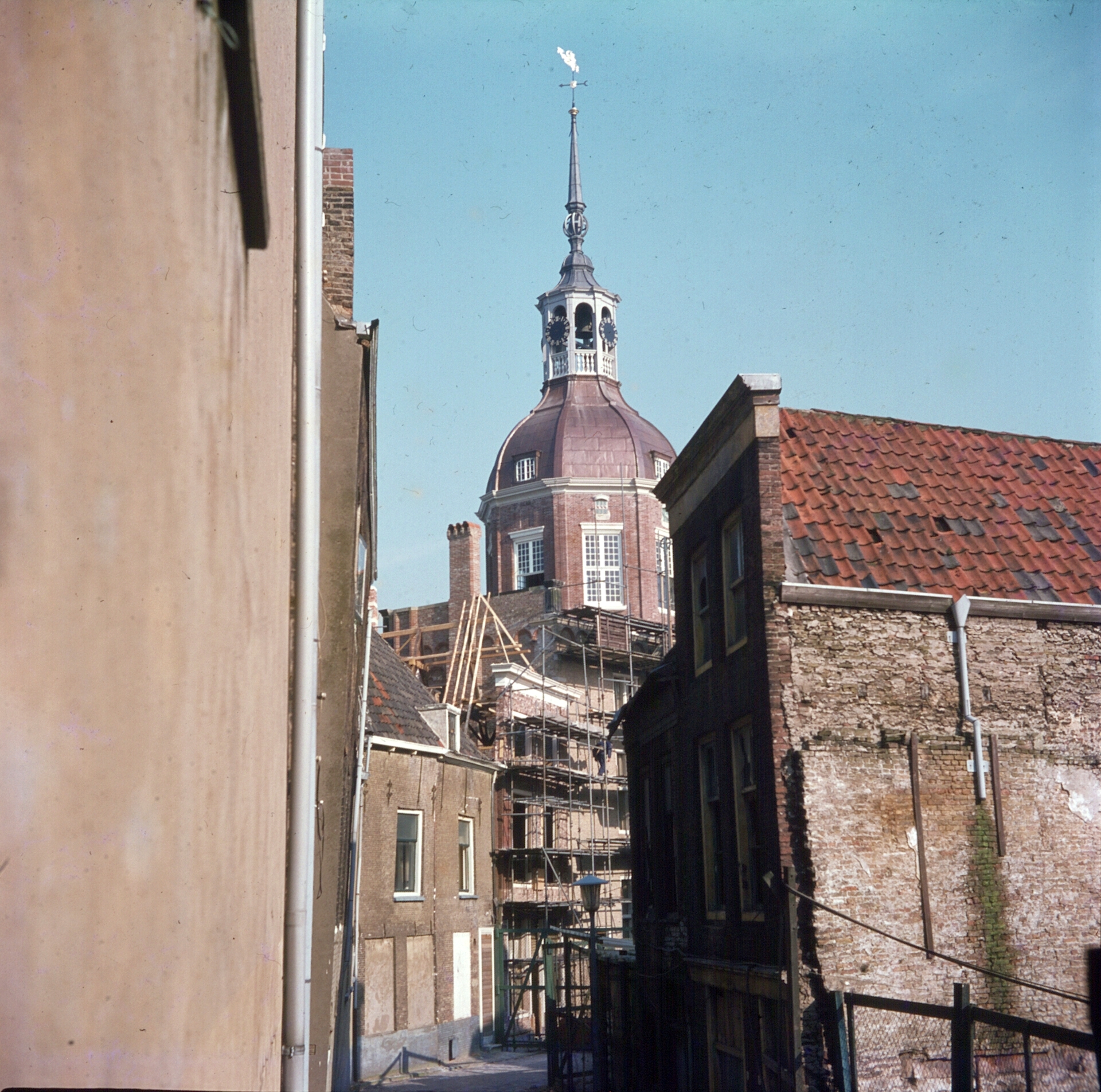 - Zicht op de Groothoofdspoort in de steigers, vanuit de Palingstraat.
