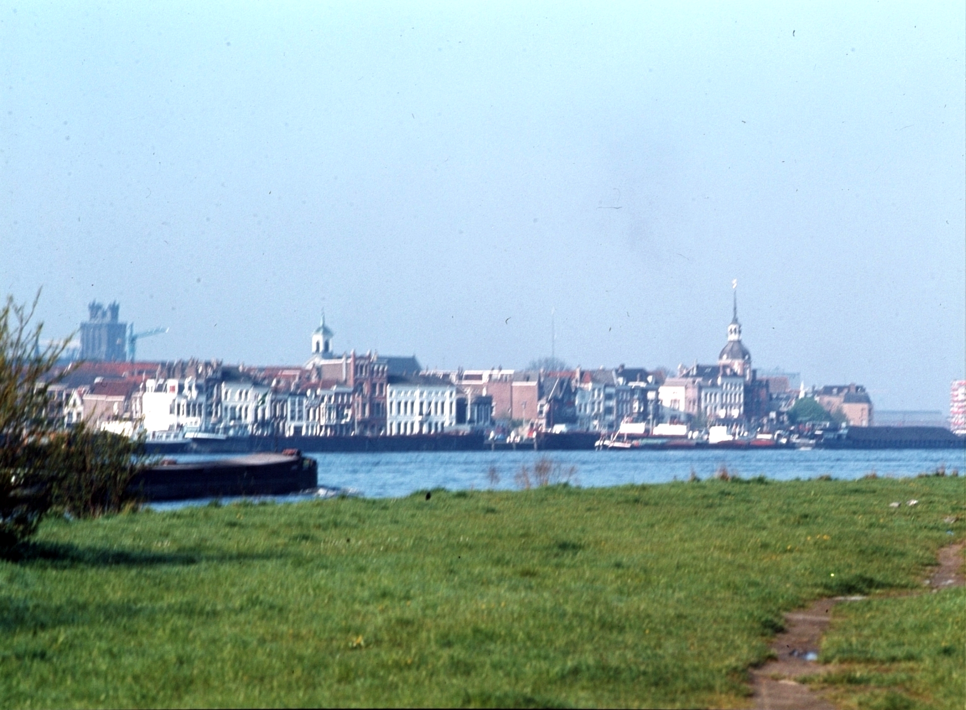 - Zicht vanaf Papendrecht op de Grote Kerk, het torentje van het Stadhuis (midden) en de toren van de Groothoofdspoort (rechts).