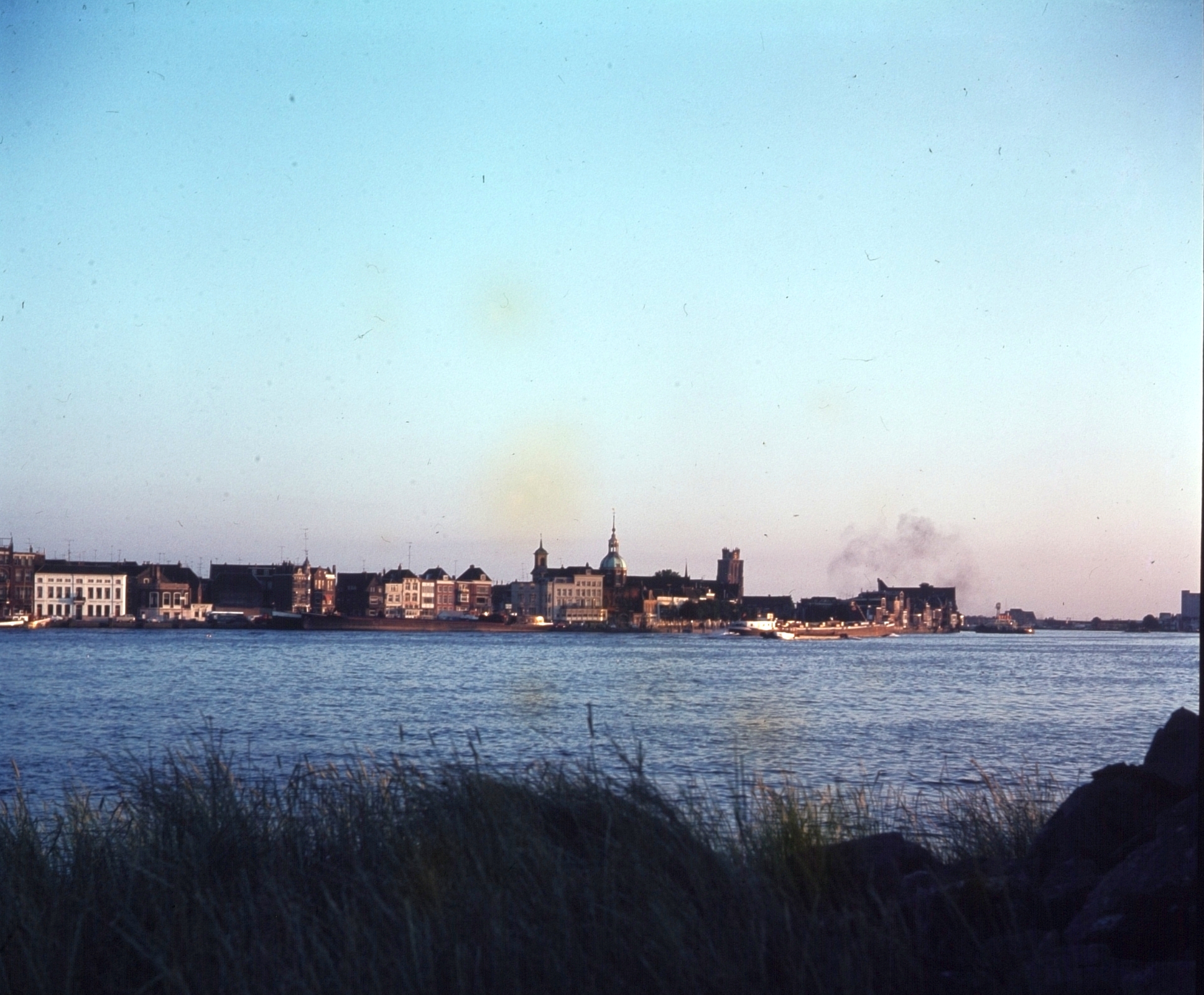 Gezicht vanaf Papendrecht op Dordrecht, in de verte het torentje van het Stadhuis, de toren van de Groothoofdspoort, en de Grote Kerk.