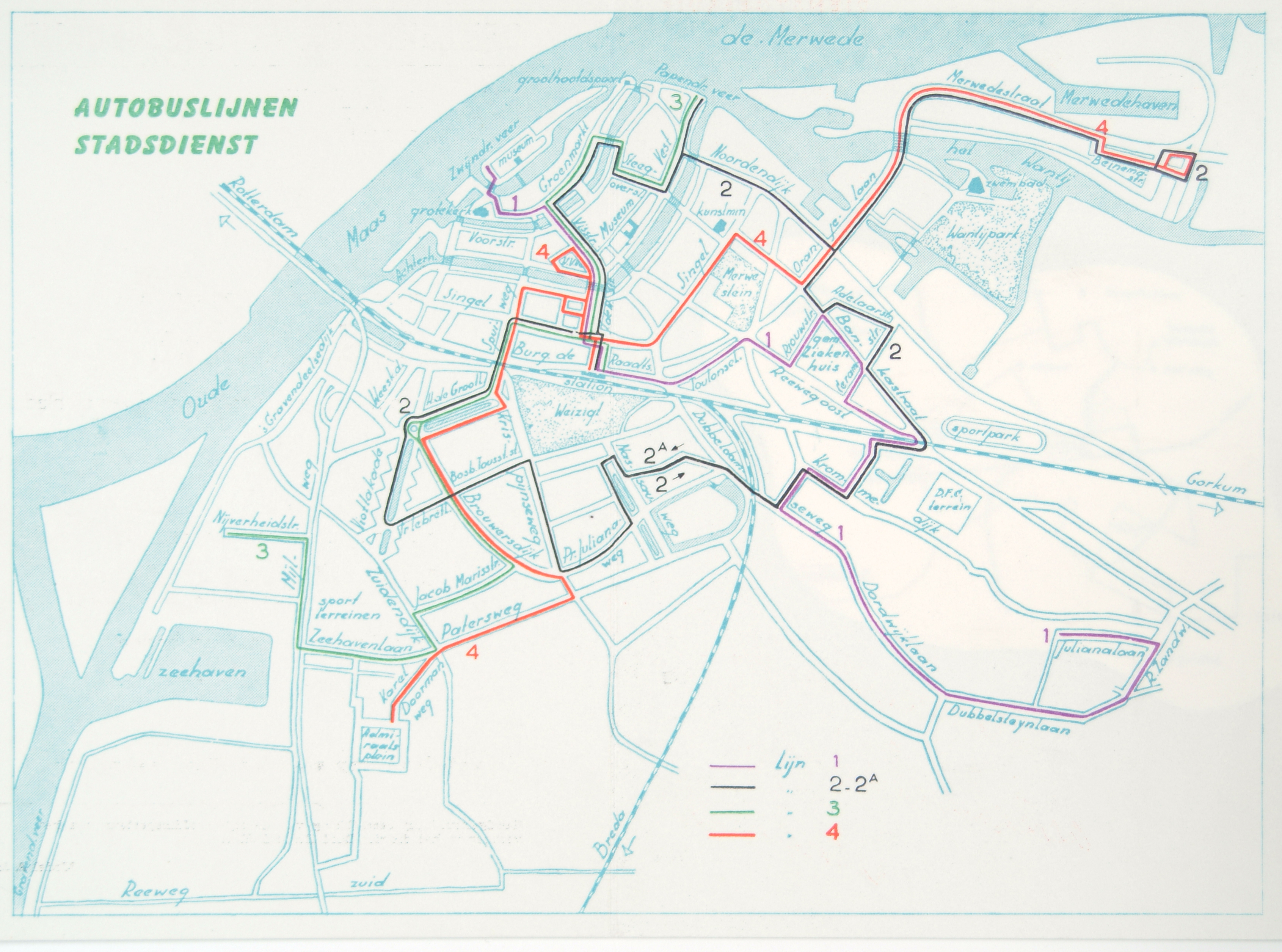 - Plattegrond van Dordrecht met de buslijnen van de stadsdienst.