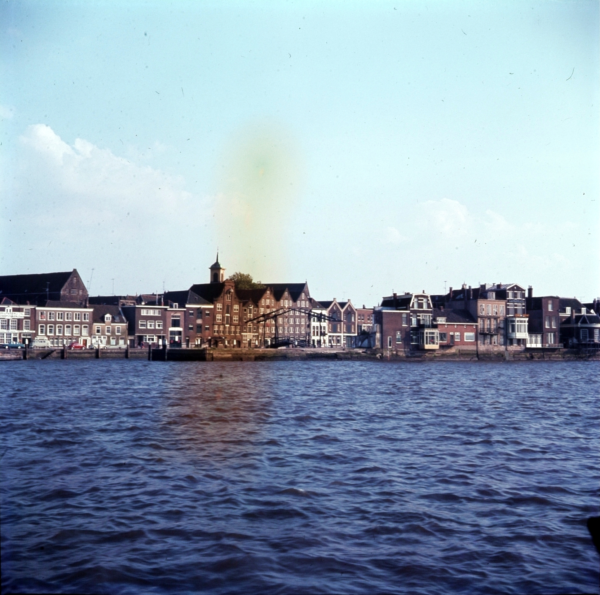 - Gezicht op Dordrecht vanaf de Oude Maas, de huizen van de Kuipershaven met de Damiatebrug bij de ingang van de Wolwevershaven.