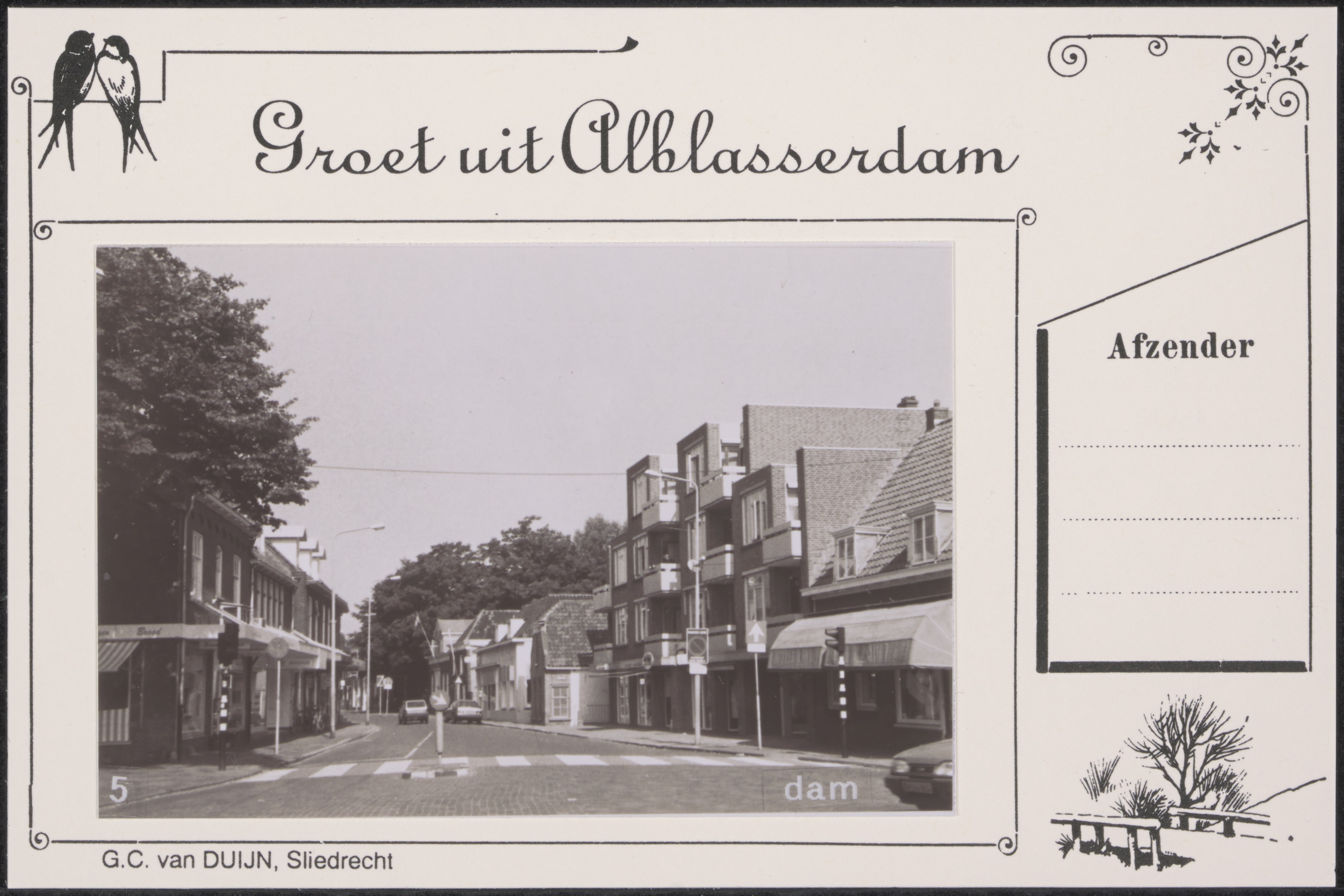 - Links bakkerij Van der Wegen en rechts bij het zonnescherm Garbo mode op de Dam in Alblasserdam