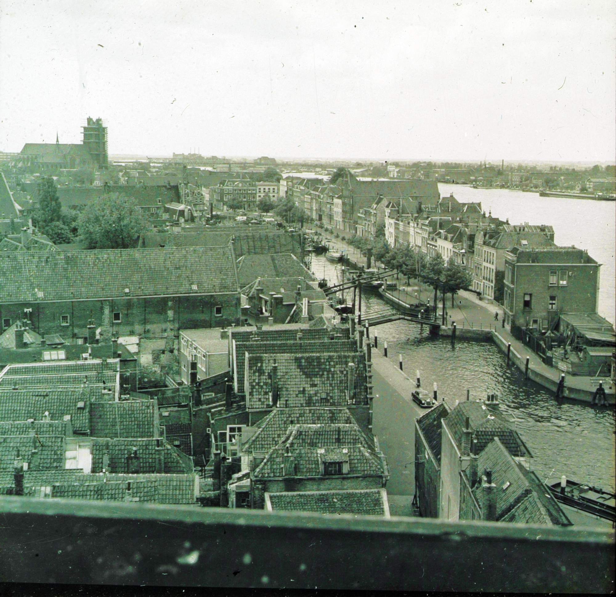 - Zicht over de daken van de oude gebouwen naar de Damiatebrug en de Wolwevershaven, op de achtergrond de Grote Kerk.