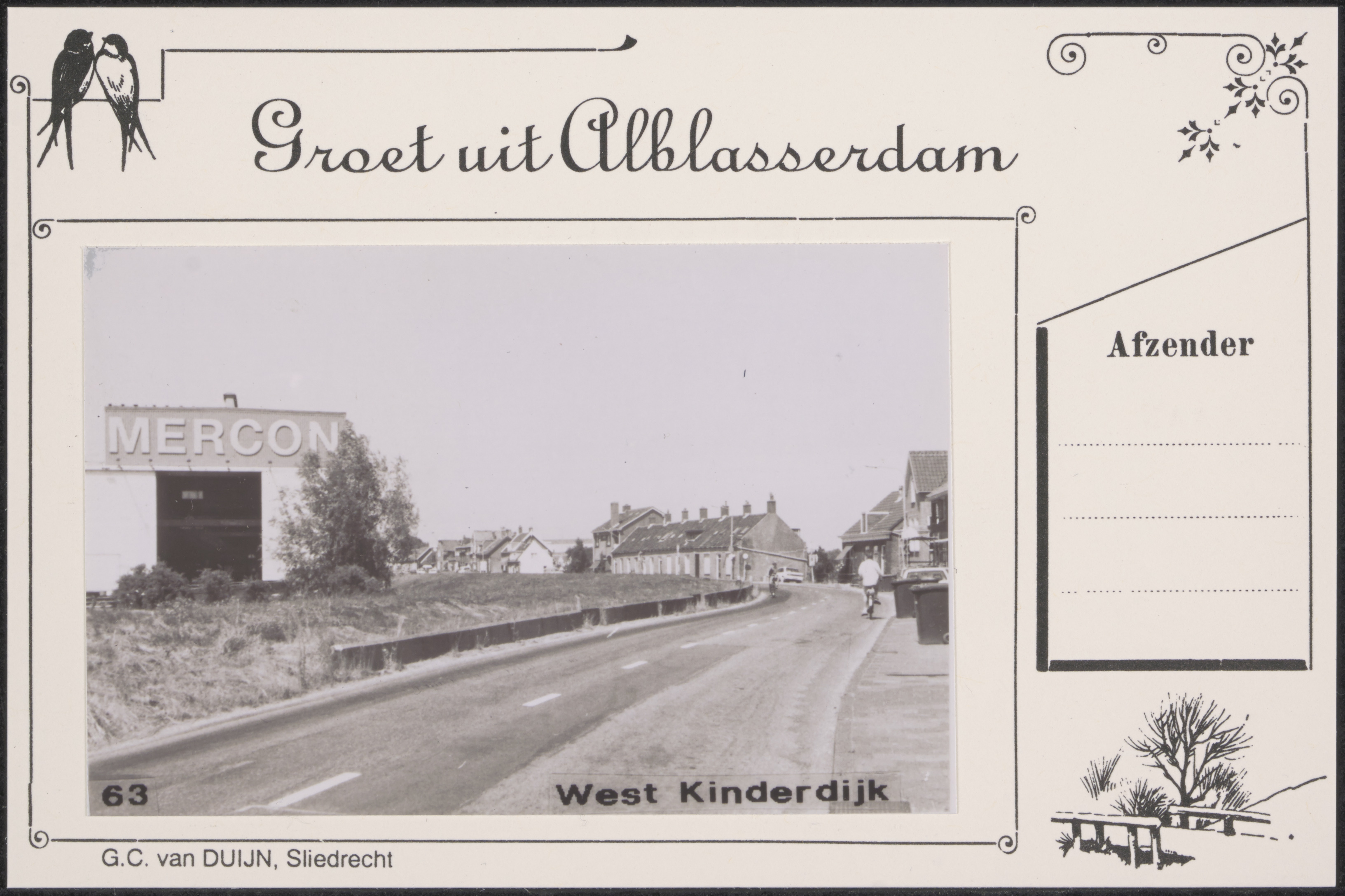 - De West Kinderdijk in Alblasserdam. Links de hal van scheepswerf het Mercon Kloos.