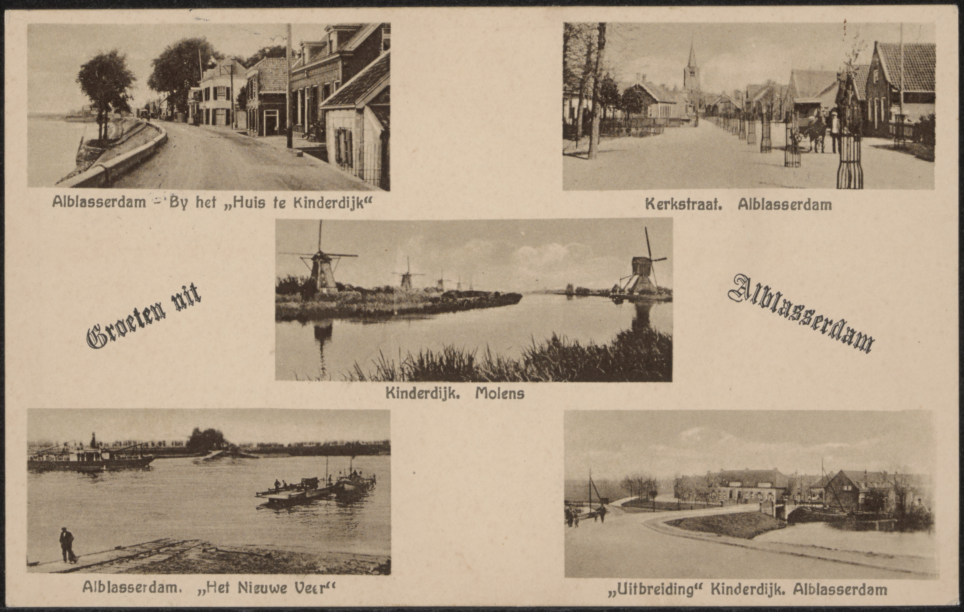 - Linksboven: Huis te Kinderdijk aan de Oost Kinderdijk in Alblasserdam. Rechtsboven: De Kerkstraat richting Oude Toren in Alblasserdam. Midden: Molens in Kinderdijk. Linksonder: Het Nieuwe Veer of Vosseveer aan de Oost Kinderdijk in Alblasserdam. Rechtsonder: Het Zwarte Paard in Alblasserdam. Links over de brug de Blokweersingel en rechts overgaand in de Fop Smitstraat.