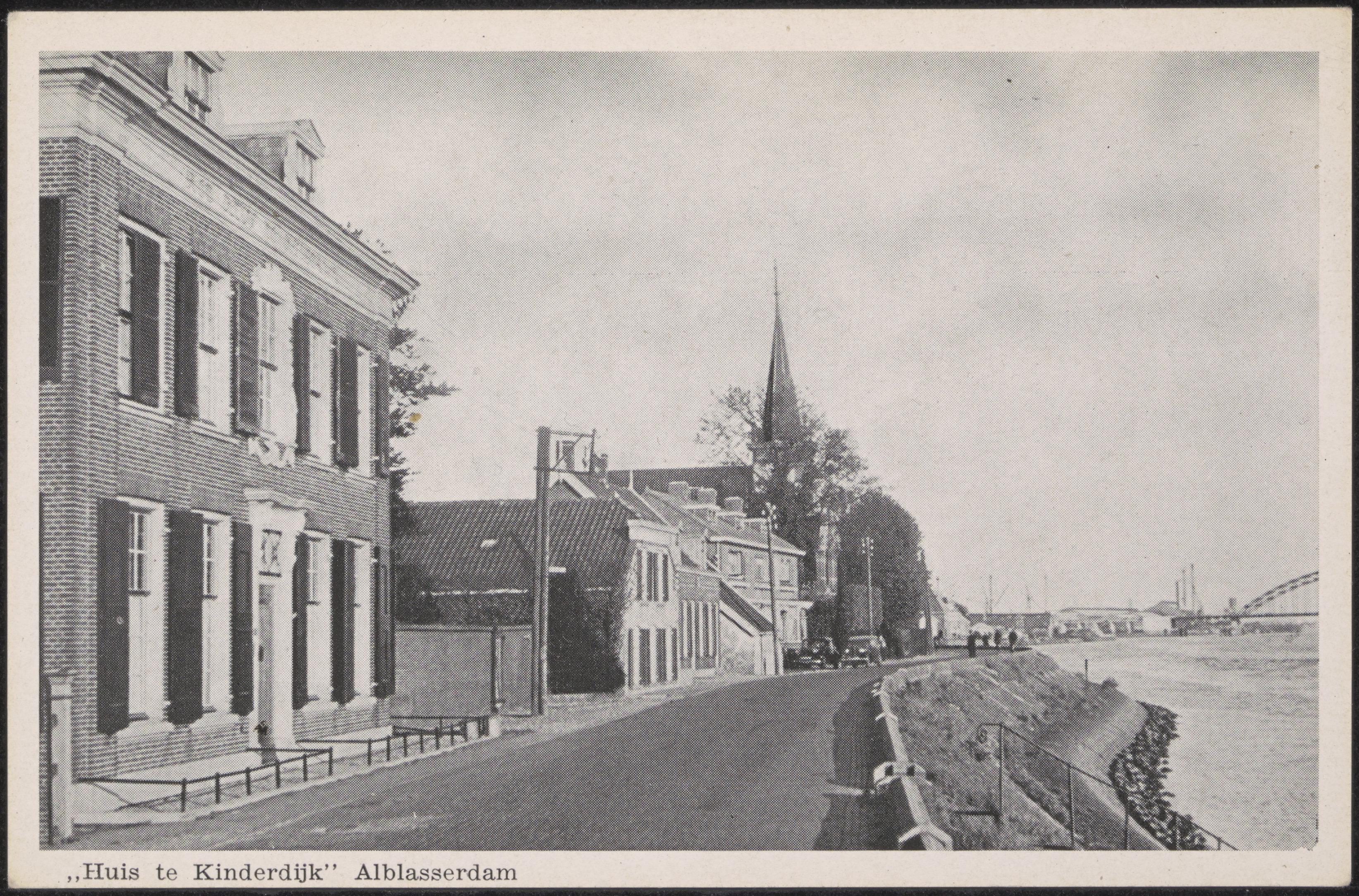 - Links vooraan Huis te Kinderdijk aan de Oost Kinderdijk in Alblasserdam. In het midden de Gereformeerde Kerk en rechts de Brug over de Noord.