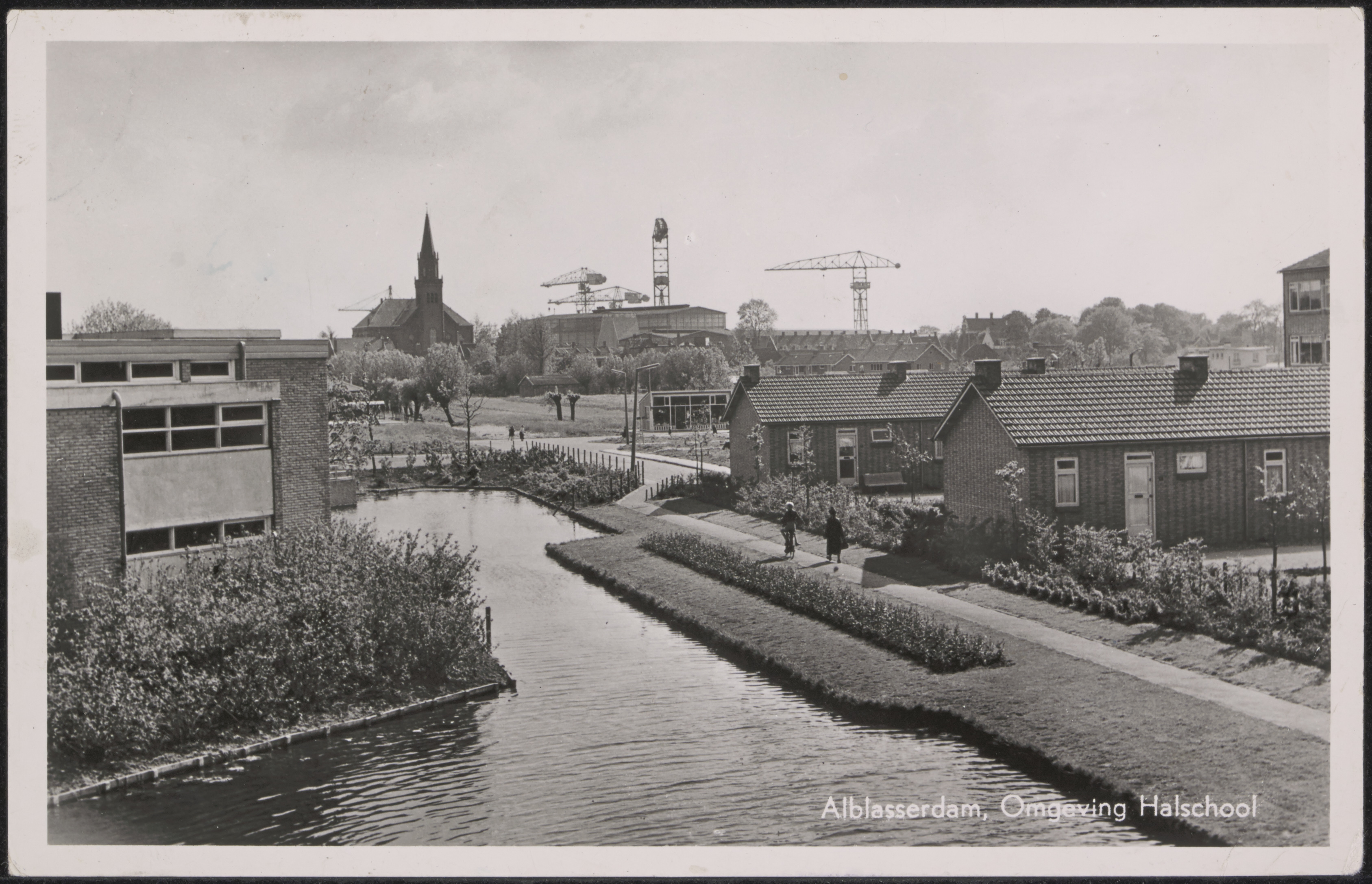 - Pad tussen de Groene Zoom (links) en de Halschool aan de Weverstraat richting Van Eesterensingel in Alblasserdam. De Grote kerk en scheepswerf De Noord op de achtergrond.