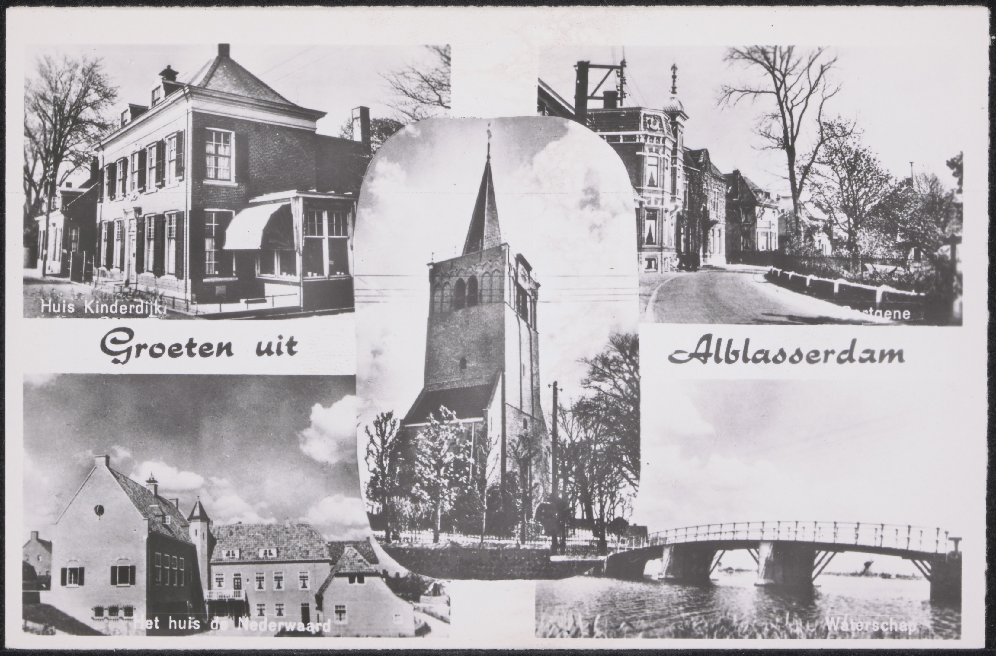 - Alblasserdam. Linksboven: Huis te Kinderdijk aan de Oost Kinderdijk. Rechtsboven: Cortgene. Midden: De Oude Toren aan de Kerkstraat. Linksonder: Het Waardhuis van de Nederwaard Rechtsonder: Brug in het Kortland.