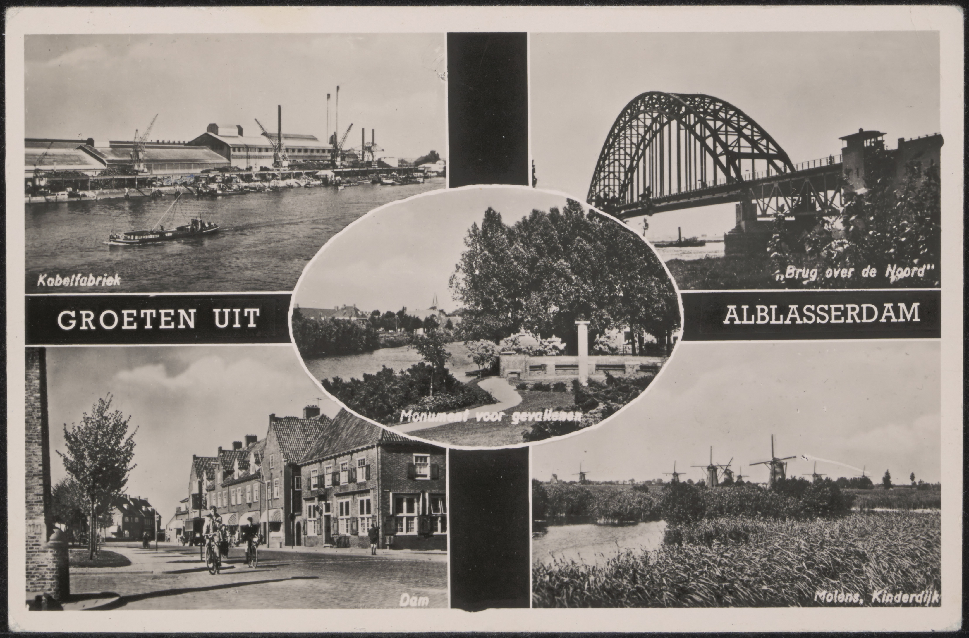 - Alblasserdam. Linksboven: De kabelfabriek. Rechtsboven: Brug over de Noord. Midden: Oorlogsmonument aan de Polderstraat. Linksonder: De Dam. Rechtsonder: Molens in Kinderdijk.