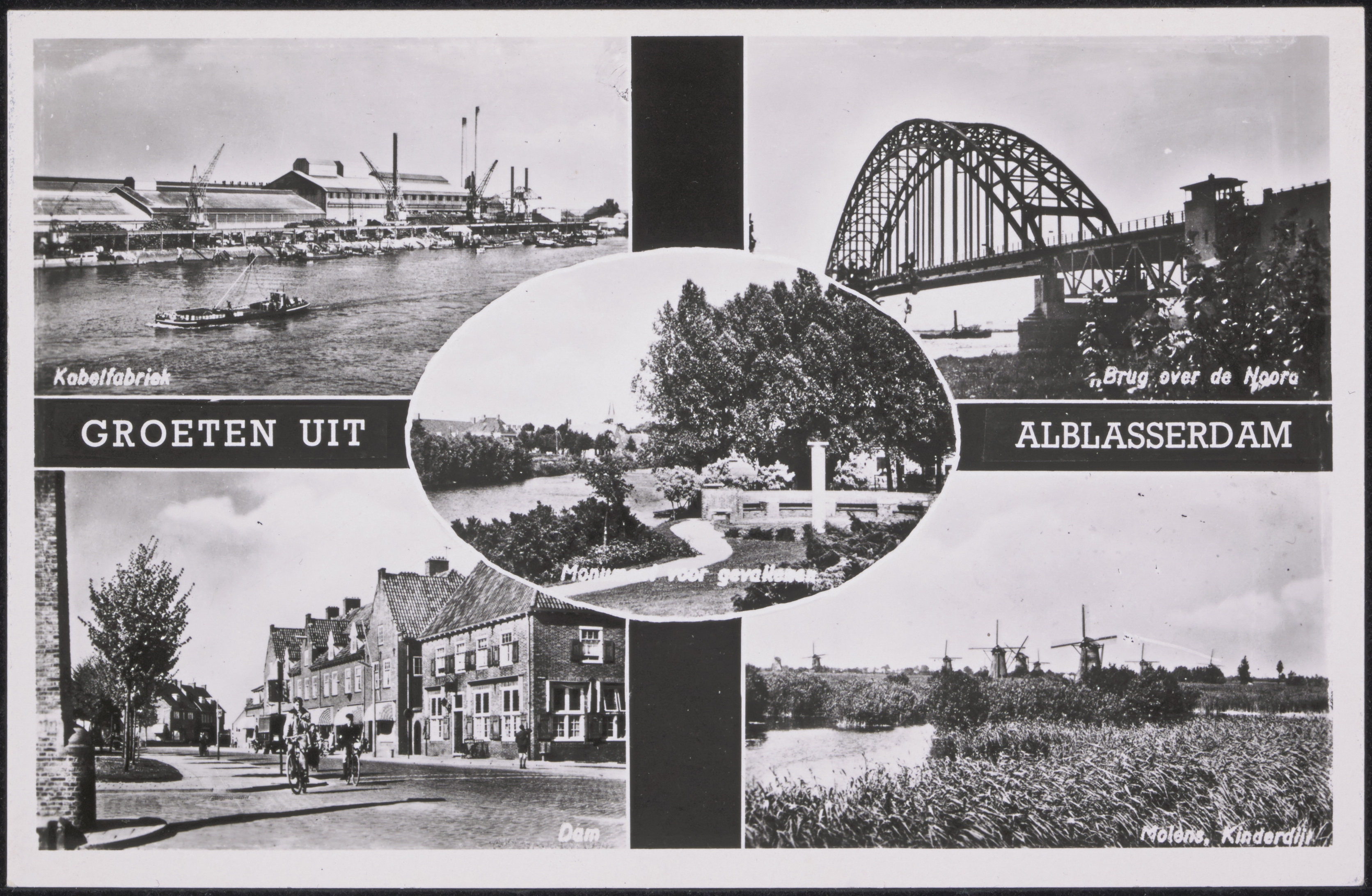 Alblasserdam. Linksboven: De kabelfabriek. Rechtsboven: Brug over de Noord. Midden: …