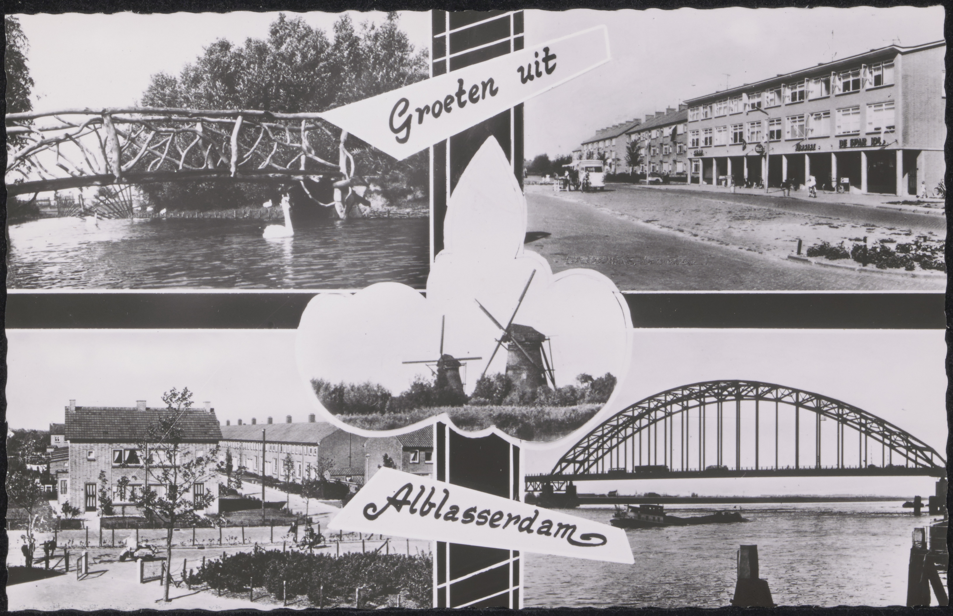 - Alblasserdam. Linksboven: Brug aan de Van Eesterensingel.. Rechtsboven: Winkelgalerij aan de Van Eesterensingel. Midden: Molens in Kinderdijk. Linksonder: Parallelweg (voorgrond) hoek Prins Bernardstraat. Rechtsonder: Brug over de Noord.