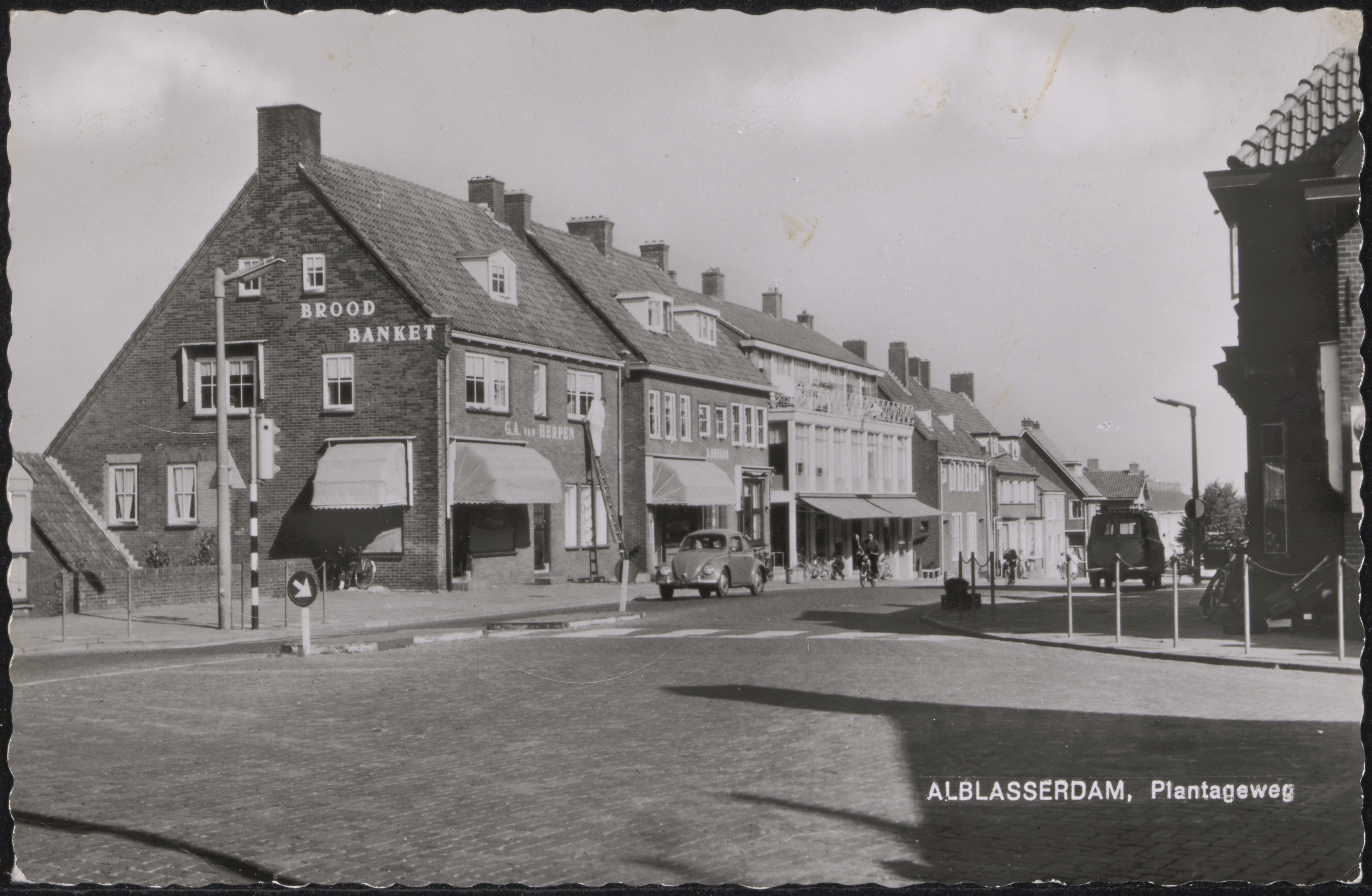- De Plantageweg in Alblasserdam. Links brood- en banketbakkerij De Heer.