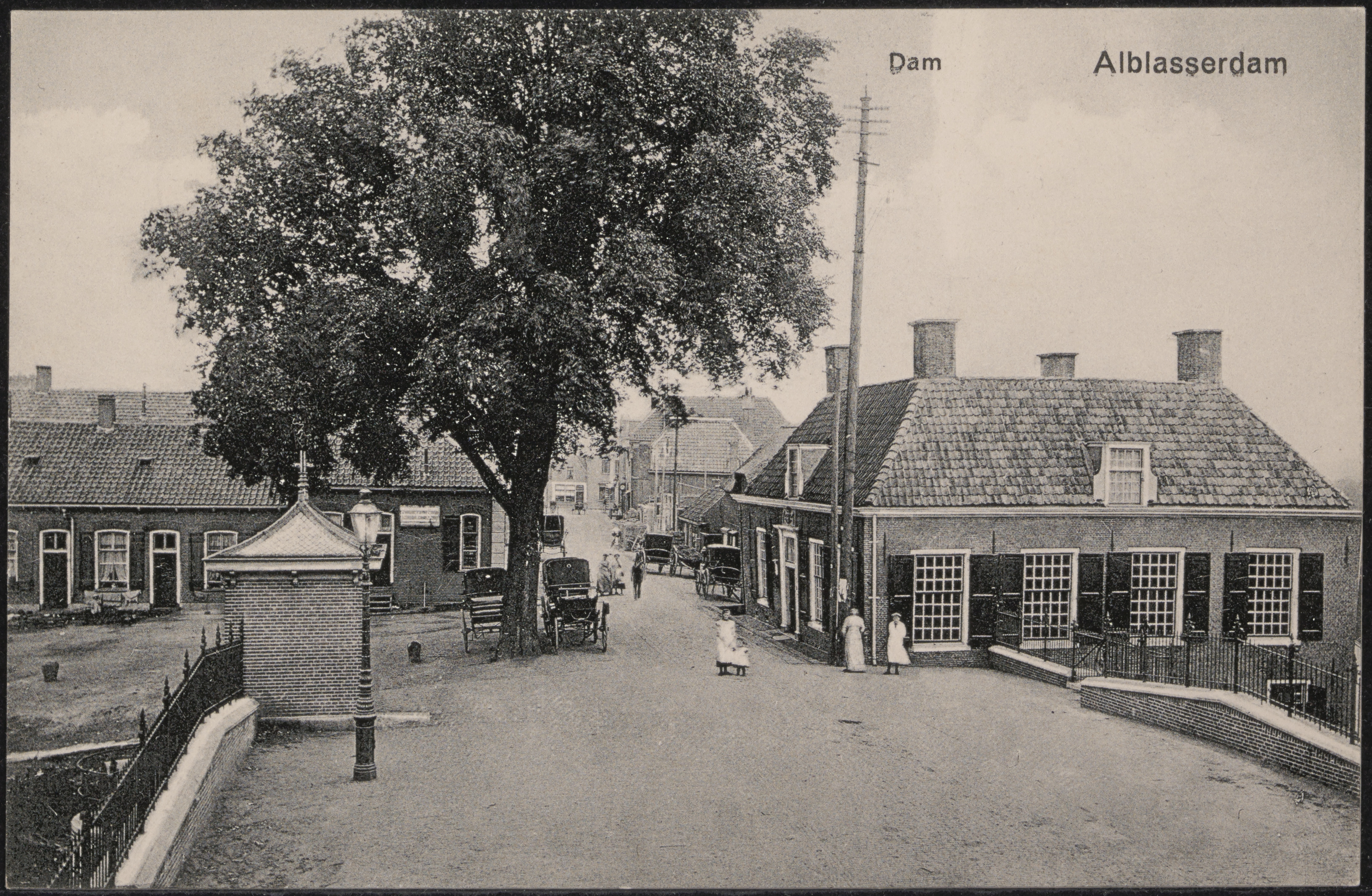 - De Dam in Alblasserdam. Rechts het oude Waardhuis van de Nederwaard voor de verbouwing, links het sluiswachtershuisje.