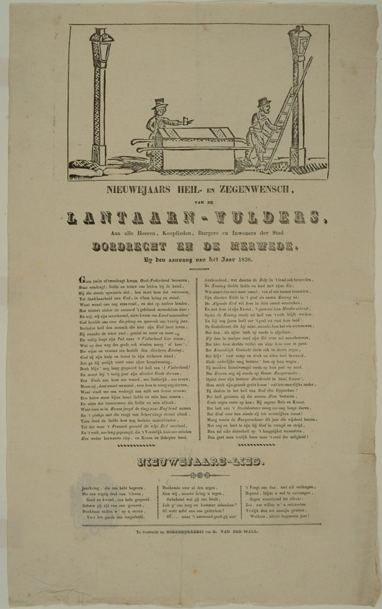 Nieuwjaarswens van de lantaarnvullers voor het jaar 1838 met een grove houtsnede voorstellende de vullers in de uitoefening van hun beroep en daaronder een gedicht in twee kolommen. en een nieuwjaarswens in drie kolommen.