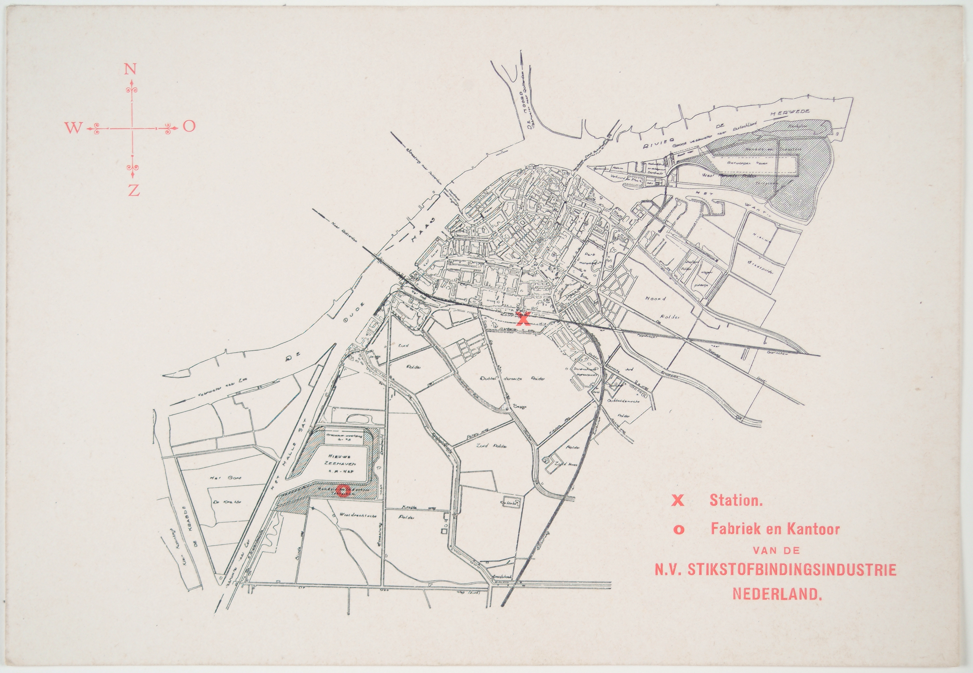 - Kaart van Dordrecht met aangegeven de vestiging van het station en de N.V. Stikstofbindingsindustrie.