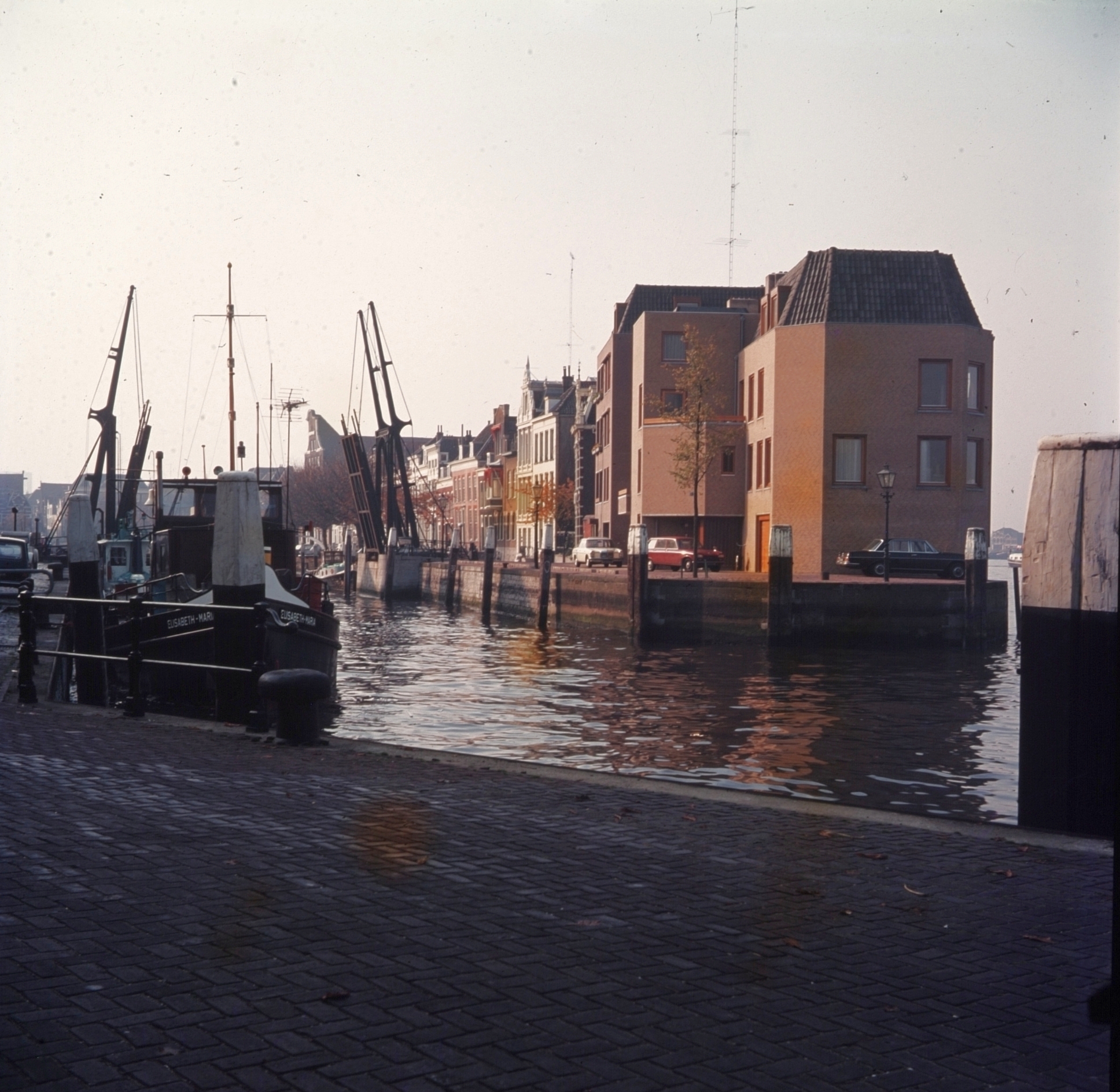 - Gezicht vanaf de Kuipershaven/Groothoofd op de ingang van de Wolwevershaven, de Damiatebrug staat open, op de voorgrond een sleepboot.