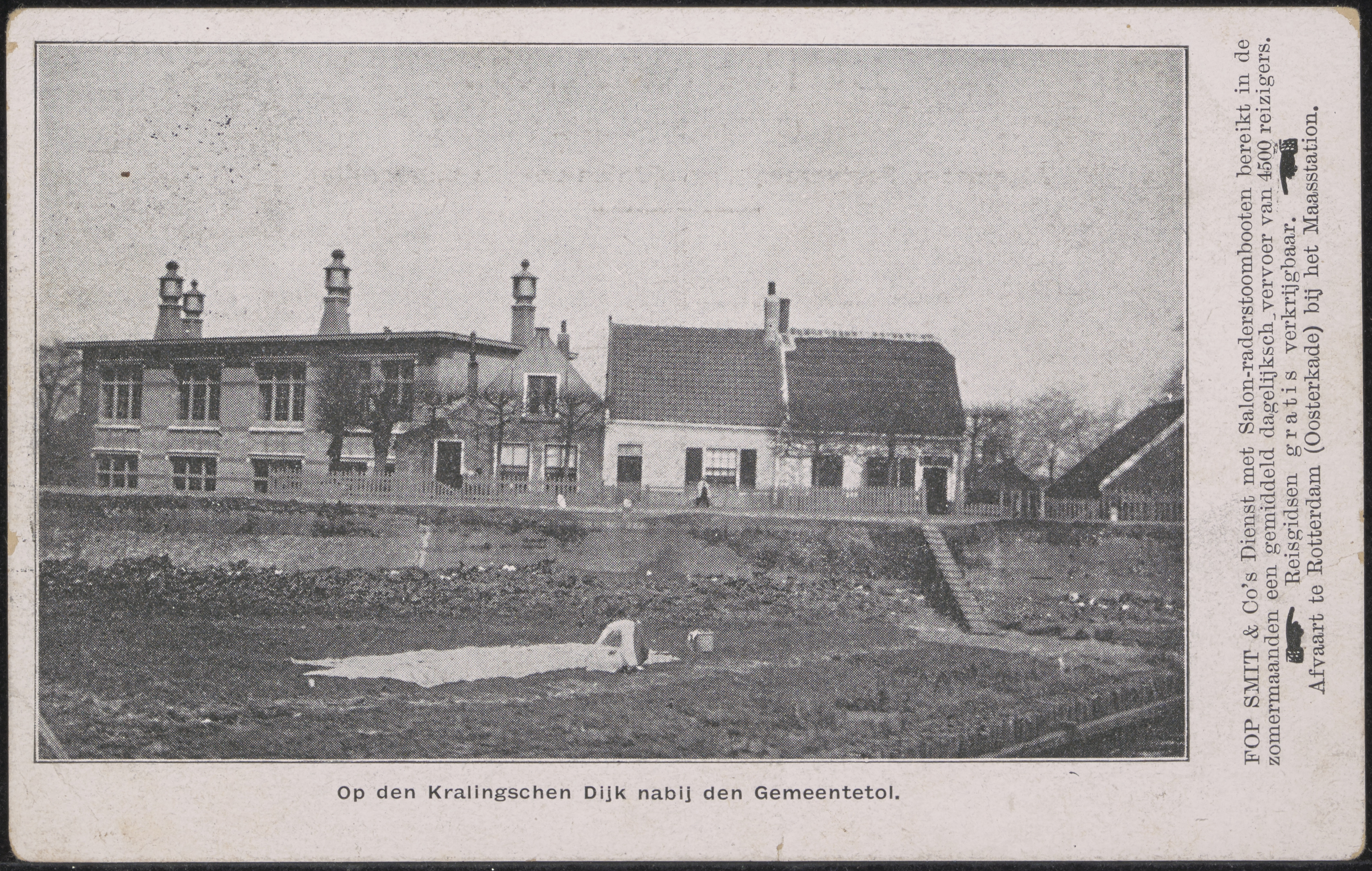 - Reclame van rederij Fop Smit voor het maken van reisjes met salonraderstoomboten met een afbeelding van de Nesserdijk met links de openbare school den Oord in Rotterdam.