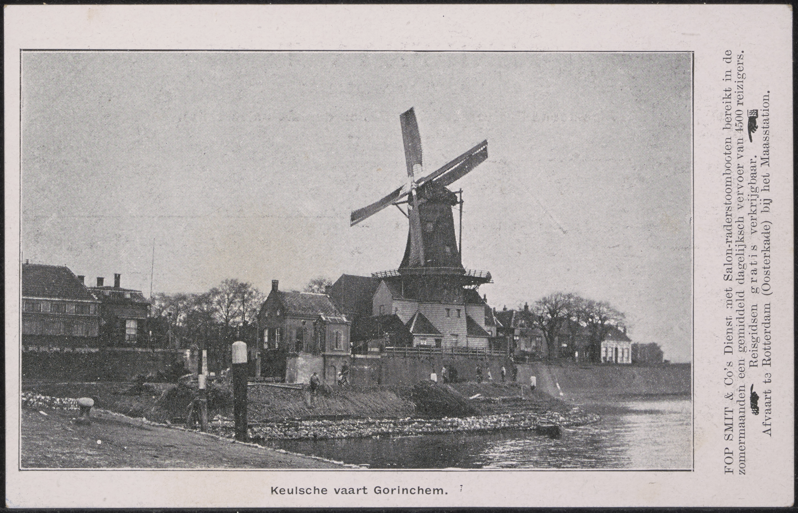 - Molen De Eendracht aan de Altenawal in Gorinchem op een reclame voor het maken van boottochtjes bij rederij Fop Smit.