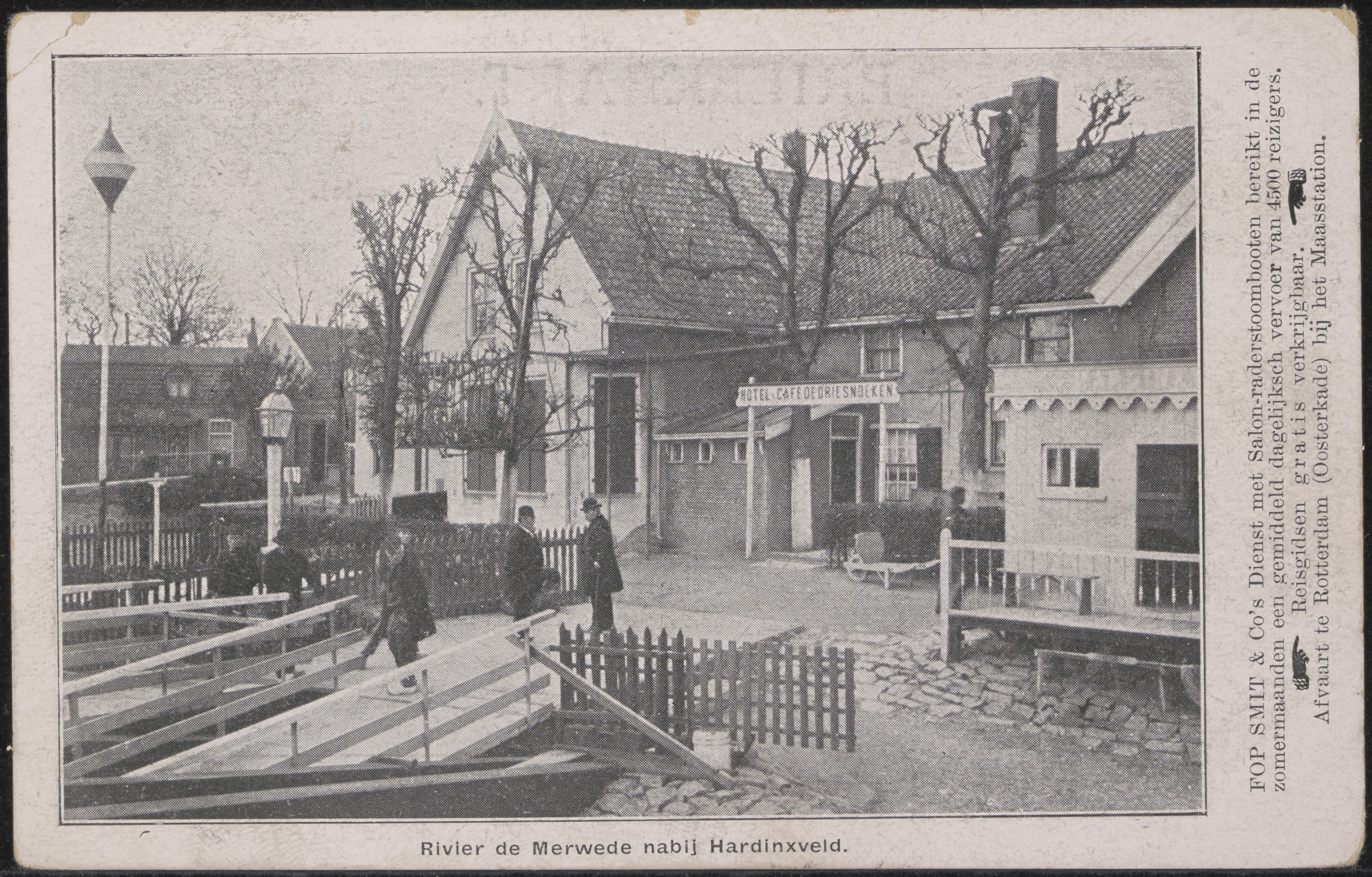 - De aanlegsteiger bij hotel De Drie Snoeken aan de Rivierdijk in Boven-Hardinxveld op een reclame voor het maken van boottochtjes bij rederij Fop Smit.