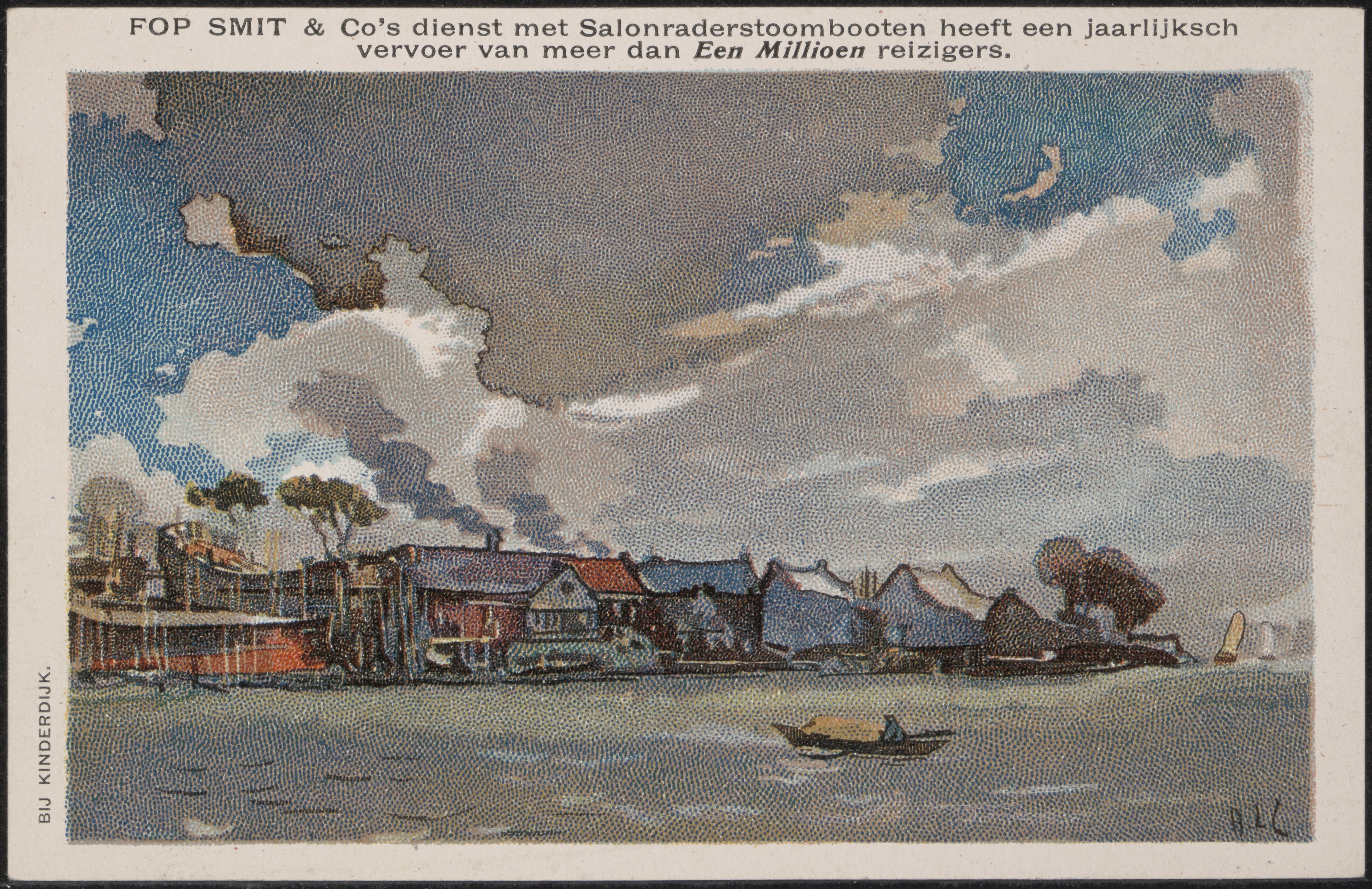 Reclame kaart van rederij Fop-Smit voor het maken van reisjes . met links de scheepswerf van J.en K.Smit in Kinderdijk gezien vanaf de Noord.
