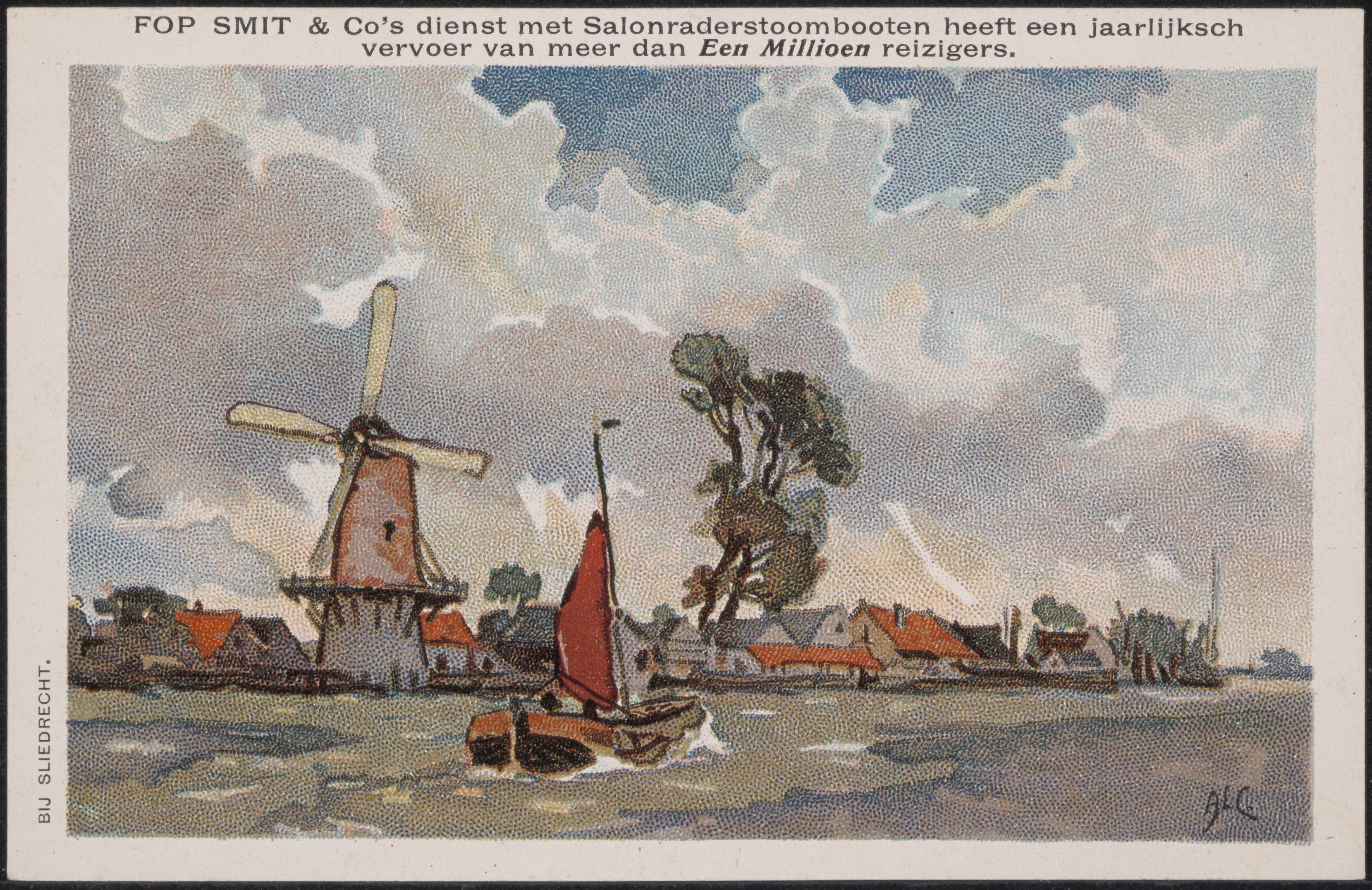 - Molen aan de Rivierdijk langs de Beneden Merwede in Sliedrecht op een reclame voor het maken van boottochtjes bij rederij Fop Smit.