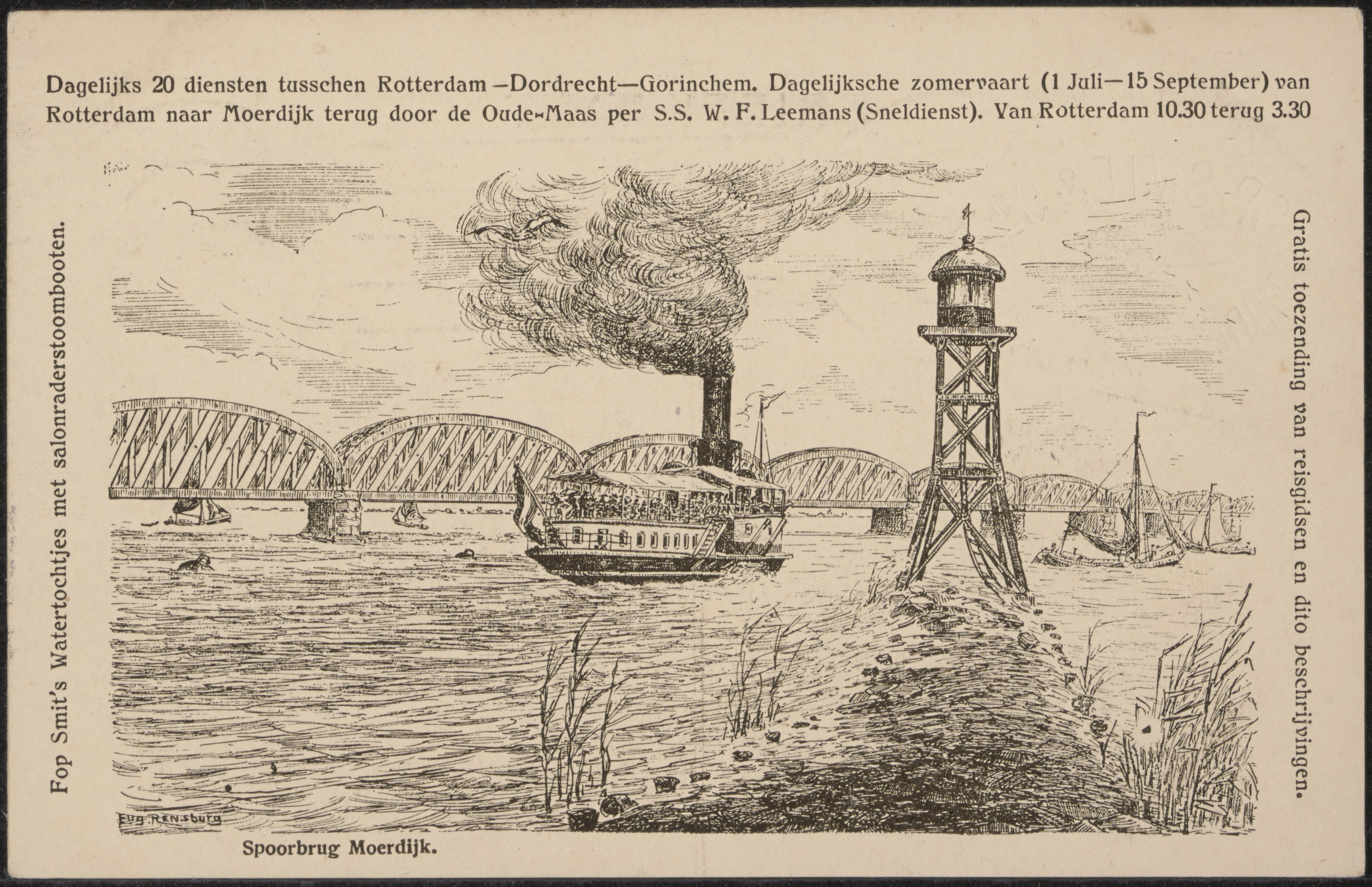 - Spoorbrug Moerdijk over het Hollandsch Diepop een reclame van rederij Fop Smit.