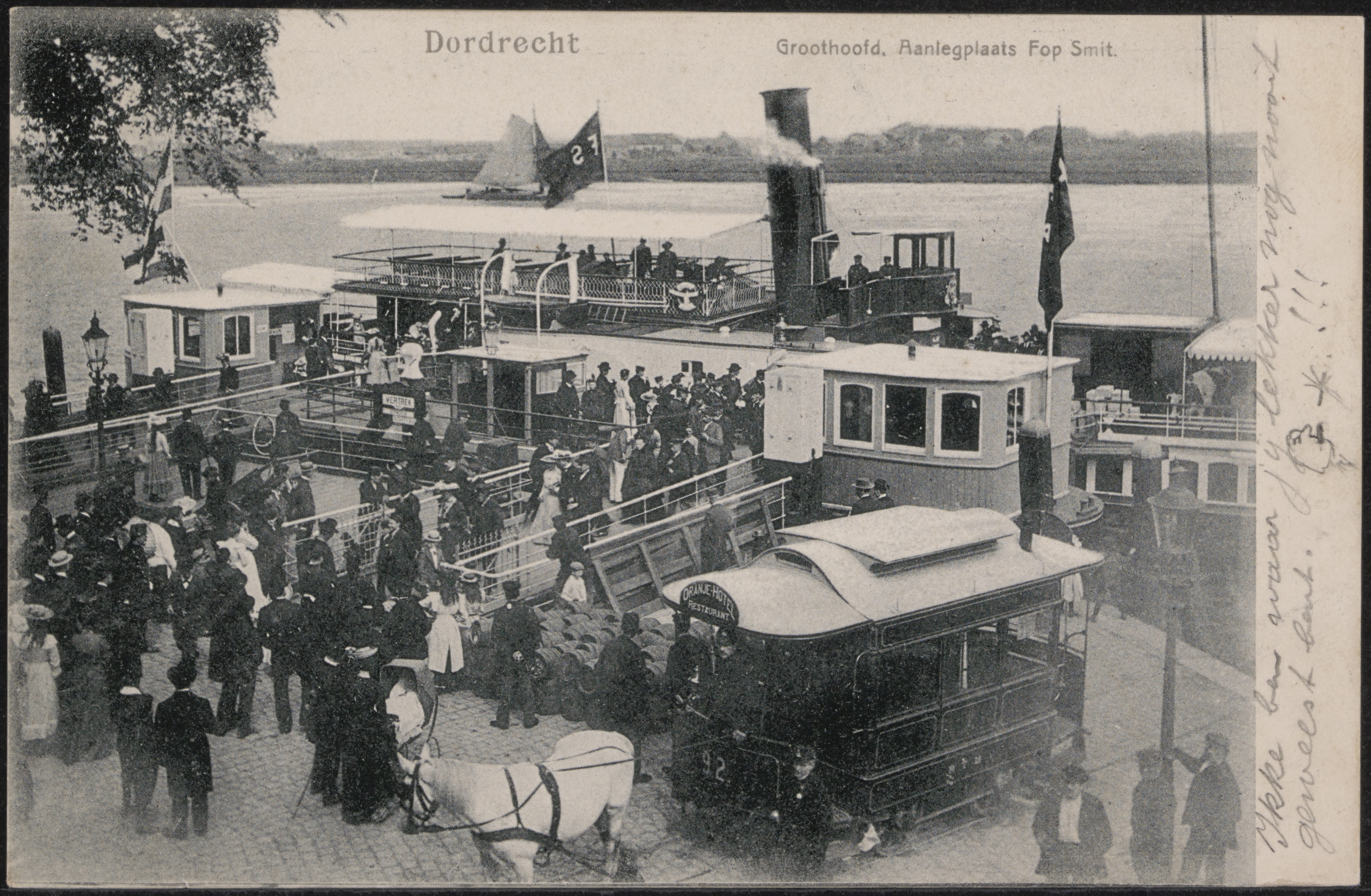 - Stoomraderboten van rederij Fop Smit aan de kade van het Groothoofd, op de voorgrond de paardentram.