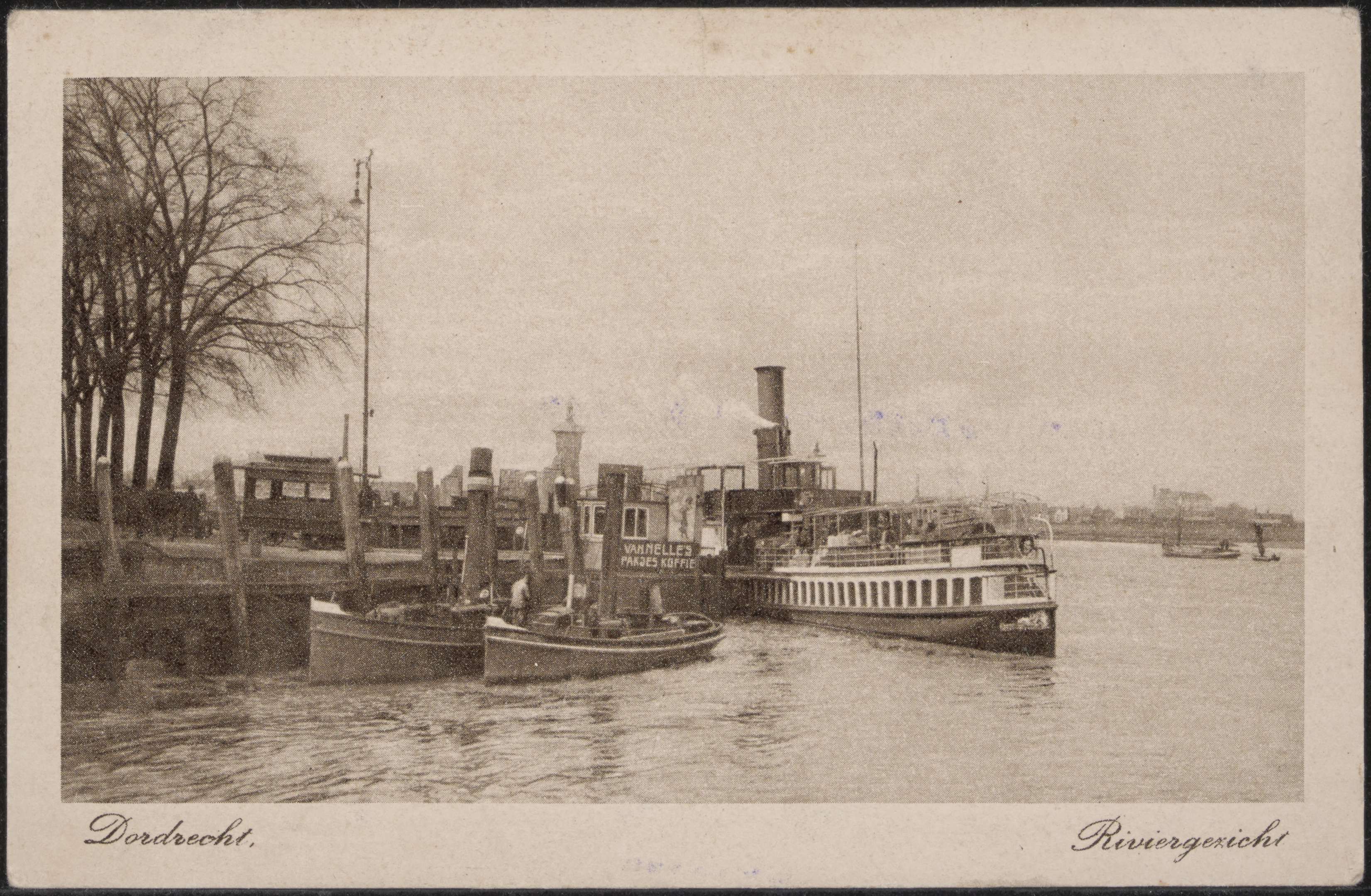 Stoomraderboot van rederij Fop-Smit nabij het Groothoofd met op de achtergrond de watertoren van Zwijndrecht met rechts er van molen Welgelegen.
