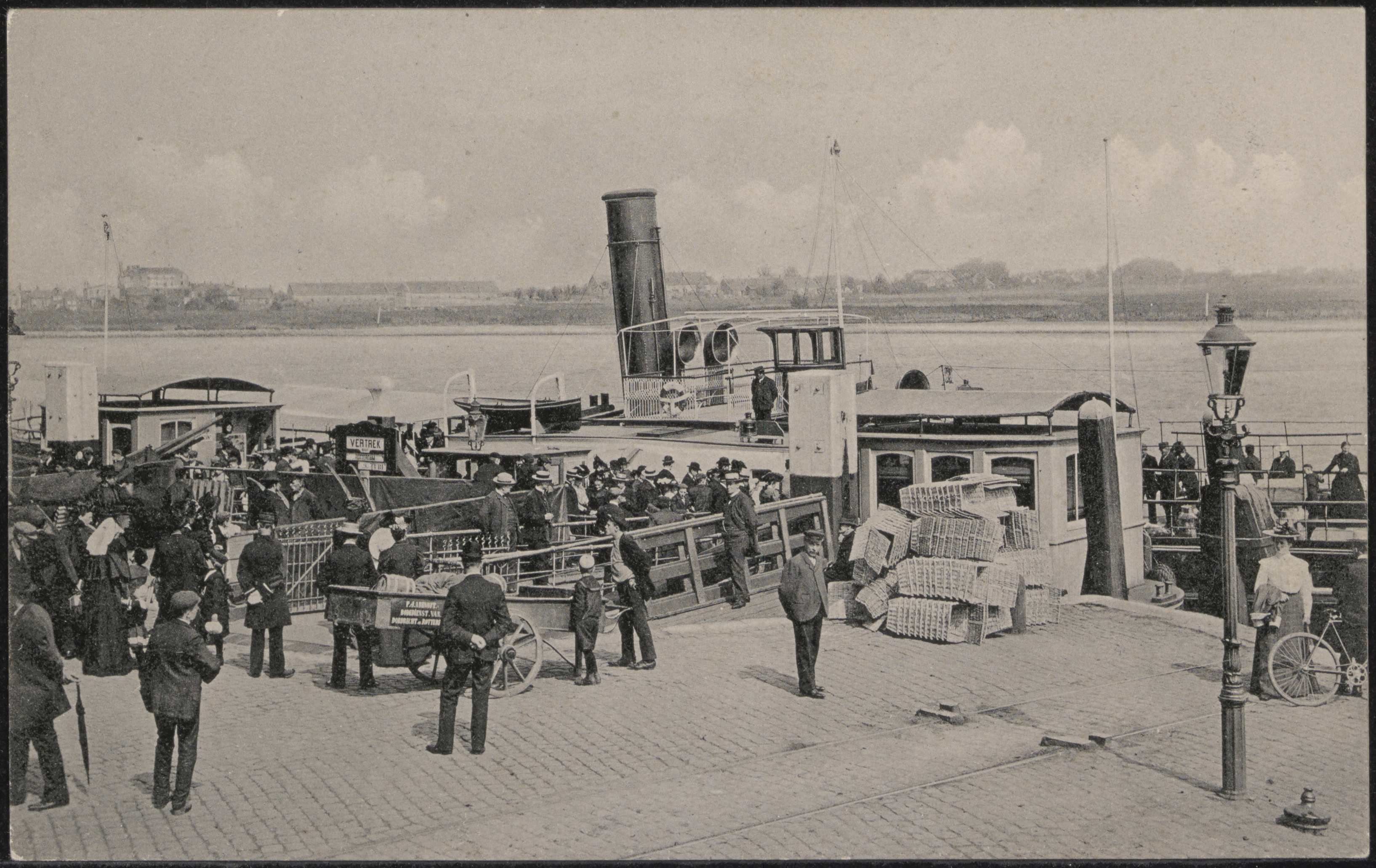 - (stoom)raderboten aanlegplaatsen handkarren lantaarns / straatverlichting reizigers